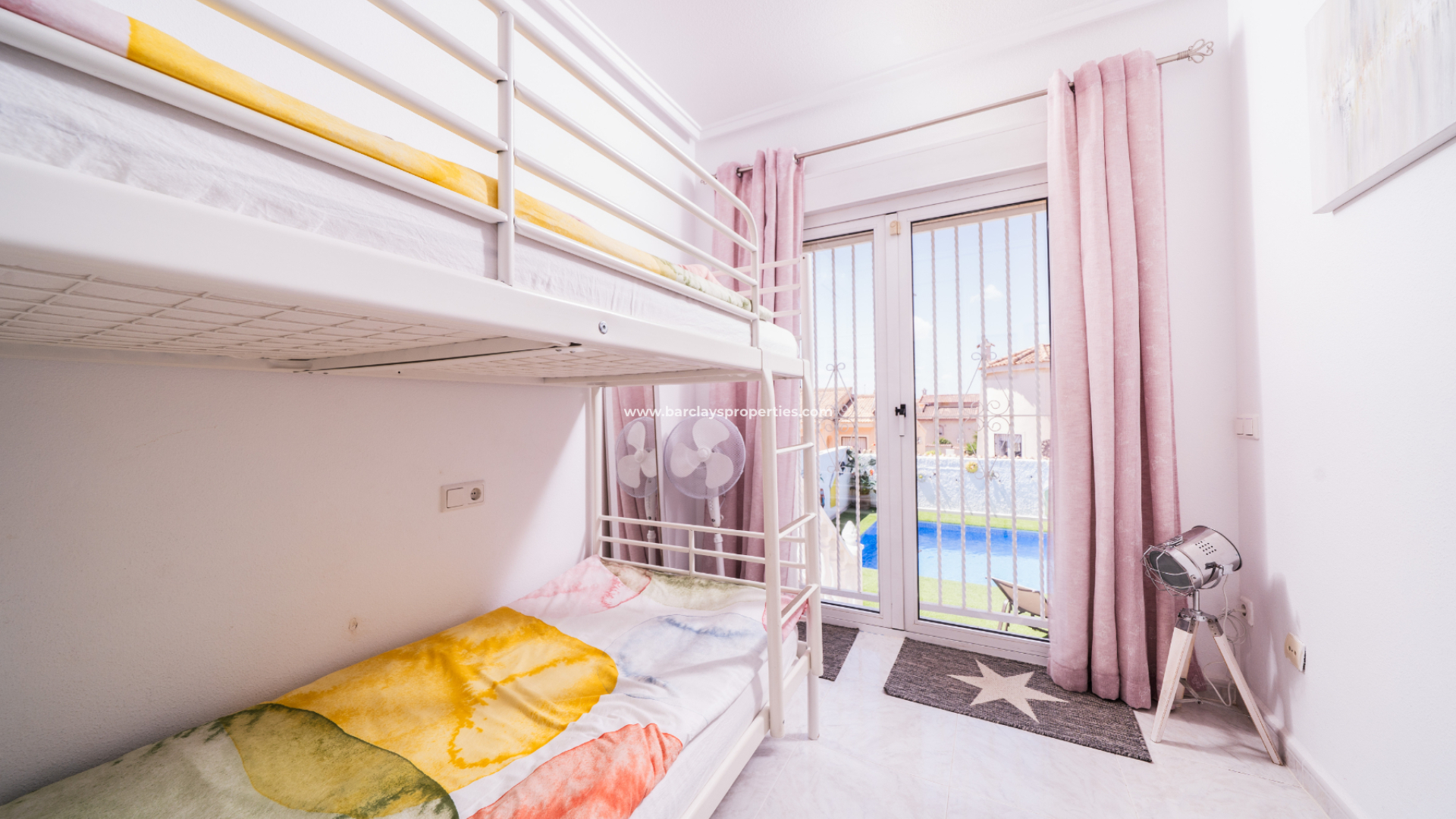 Det stora sovrummet har en dubbel inbyggd garderob, takfläkt och luftkonditionering. Det andra sovrummet med inbyggd förvaring och luftkonditionering har också altandörrar som leder direkt ner till poolområdet. Badrummet har ett badkar i full storlek med dusch, toalett, bidé och ett modernt handfat.