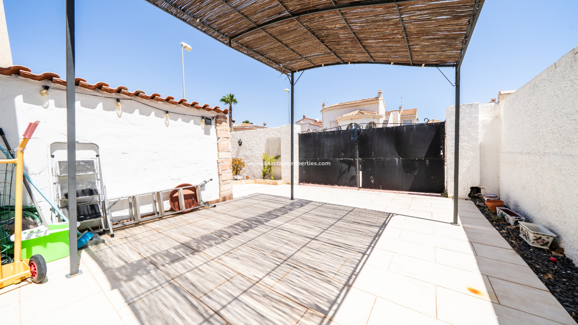 Utanför är den pittoreska trädgården välskött och har ➡️ en privat 7 x 4 meter pool med ett djup på 1,80 meter, en soldusch och en pergola-täckt sittgrupp - perfekt för avkoppling eller underhållning. Poolområdet har en konstgräsyta som ger en färgklick till den bakre trädgården. Det finns också en carport, ett förråd i metall och ➡️ ett solarium som erbjuder härlig utsikt över bergen och slående solnedgångar.
