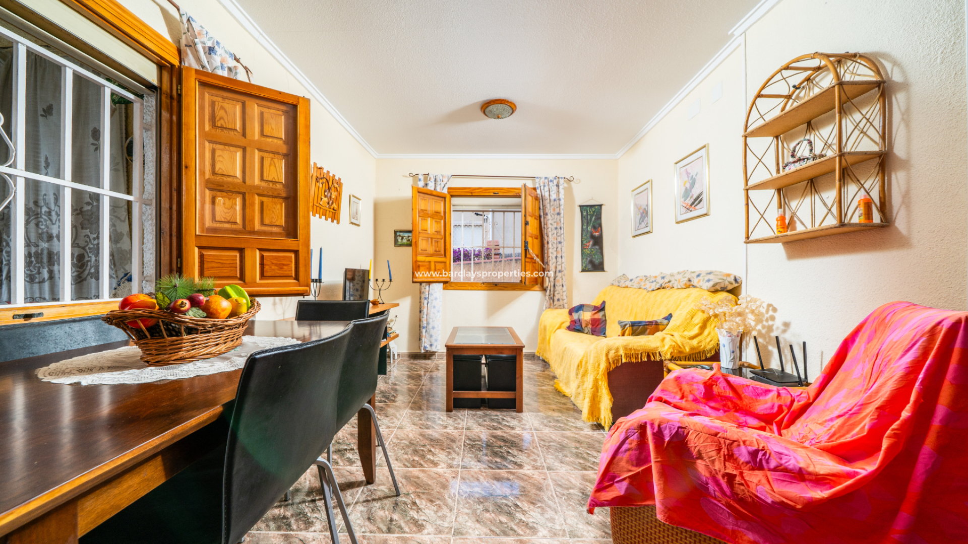En inglasad veranda med sittgrupp leder till det rymliga vardagsrummet med matplats – perfekt för avkoppling eller för att ta emot gäster – medan det separata köket med utgång till trädgården ger både funktionalitet och bekvämlighet. Två rymliga sovrum och ett badrum med medelhavsbadkar/dusch, WC och handfat kompletterar denna våning.