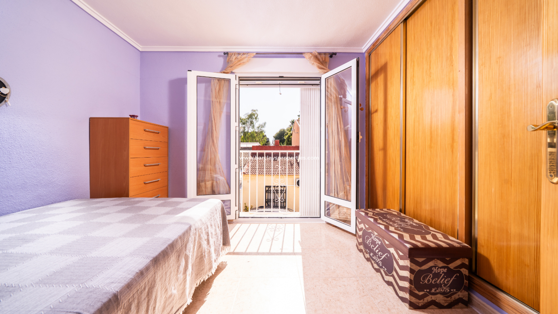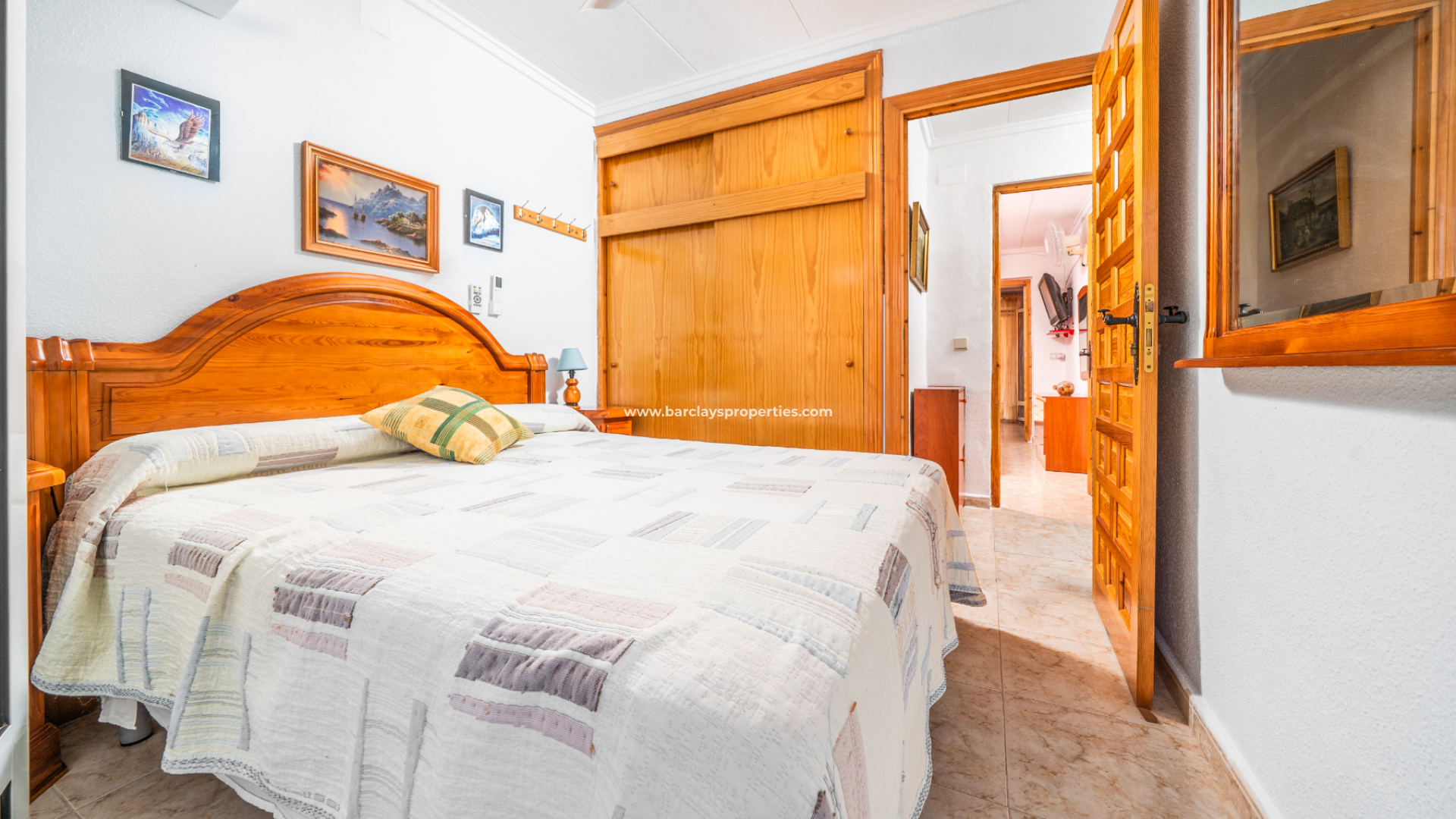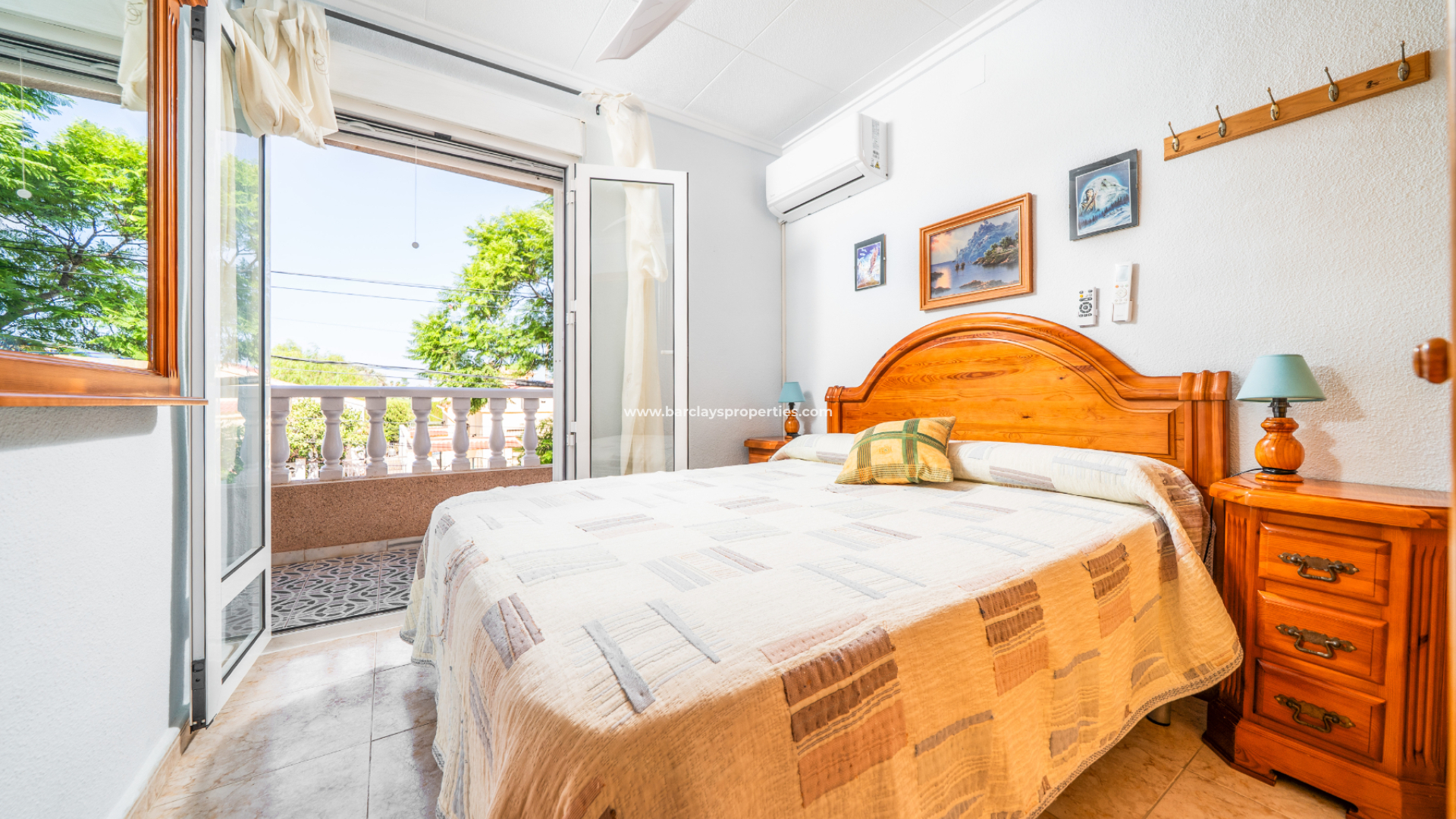 På övervåningen har huvudsovrummet en inbyggd garderob, luftkonditionering, takfläkt och altandörrar som öppnas mot en balkong. Det andra dubbelrummet har också inbyggda garderober och en fransk balkong. Ett annat rum, som för närvarande används som sovrum, har luftkonditionering och fungerar väl som omklädningsrum eller kontor. Badrummet på övervåningen är utrustat med dusch, WC och handfat.