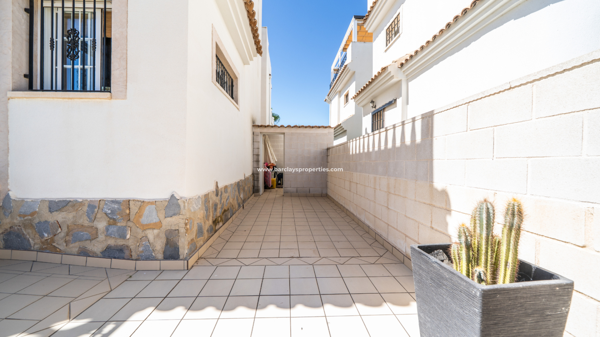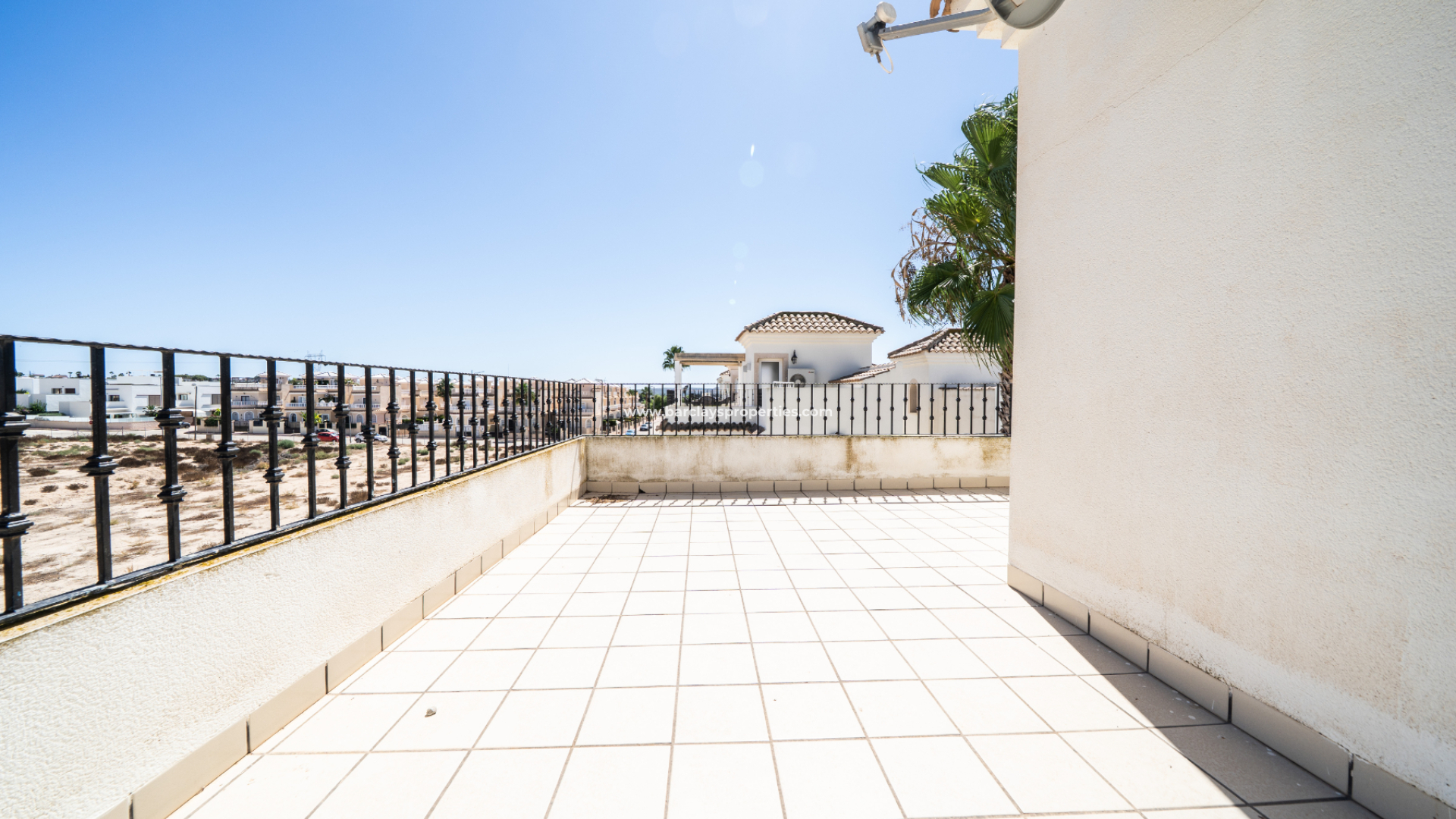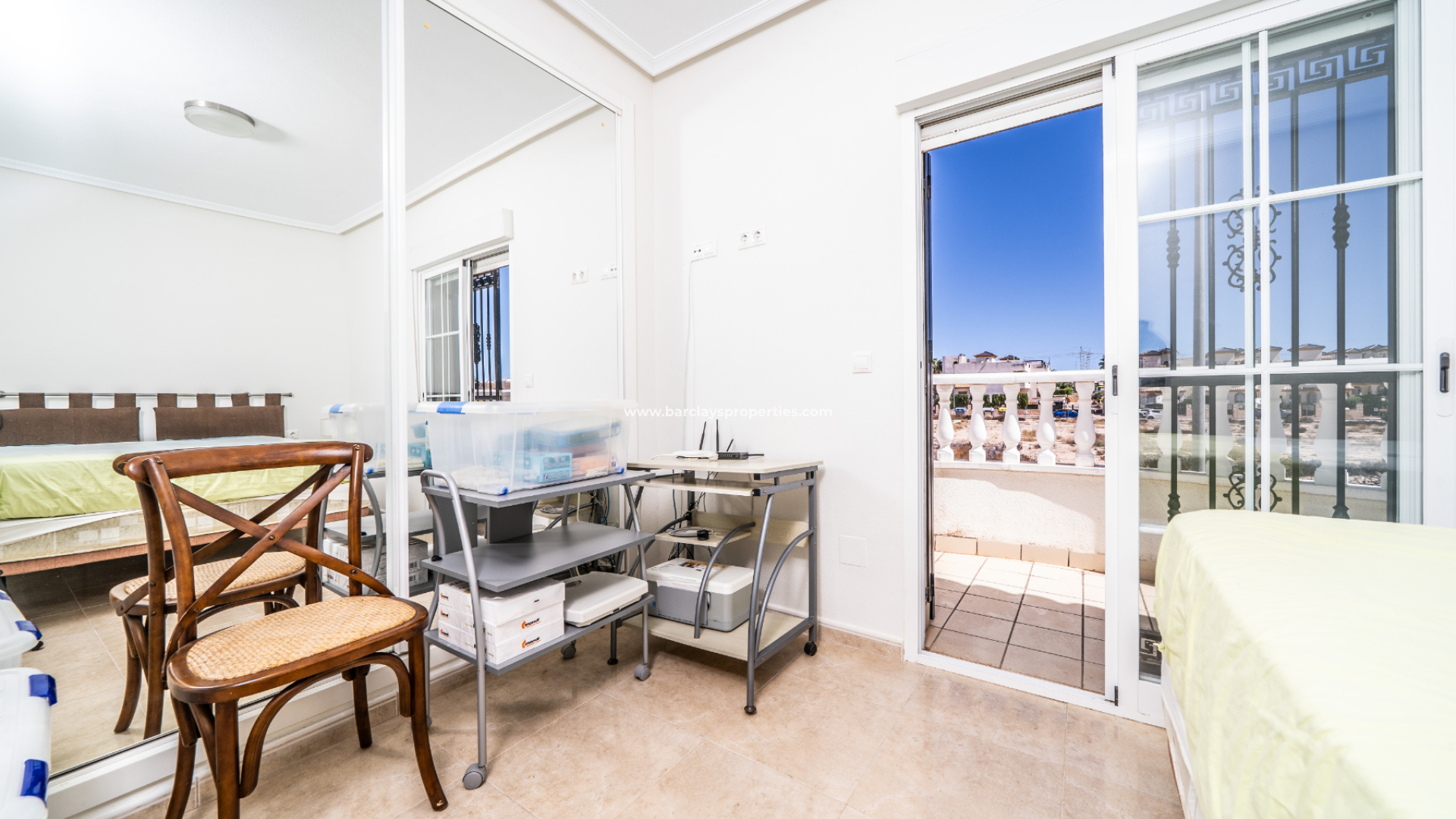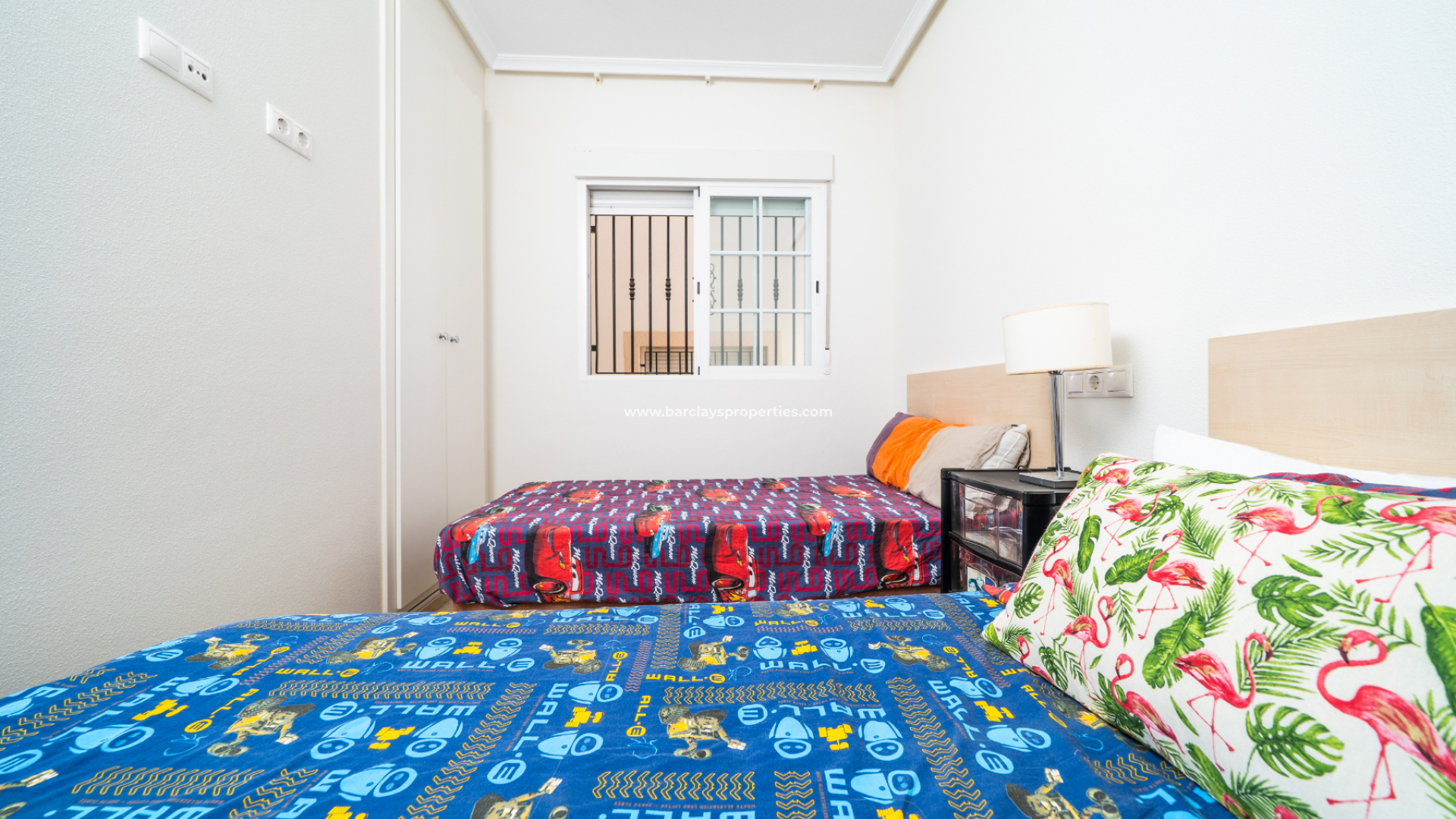 På övervåningen är det andra sovrummet utrustat med våningssängar, garderobeförvaring och altandörrar som öppnar upp till en balkong. Det stora sovrummet har också speglade inbyggda garderober, altandörrar till balkongen med utsikt över urbanisationen och även på denna våning hittar vi ett familjebadrum med badkar i full storlek, bidé, toalett och badrumsskåp.