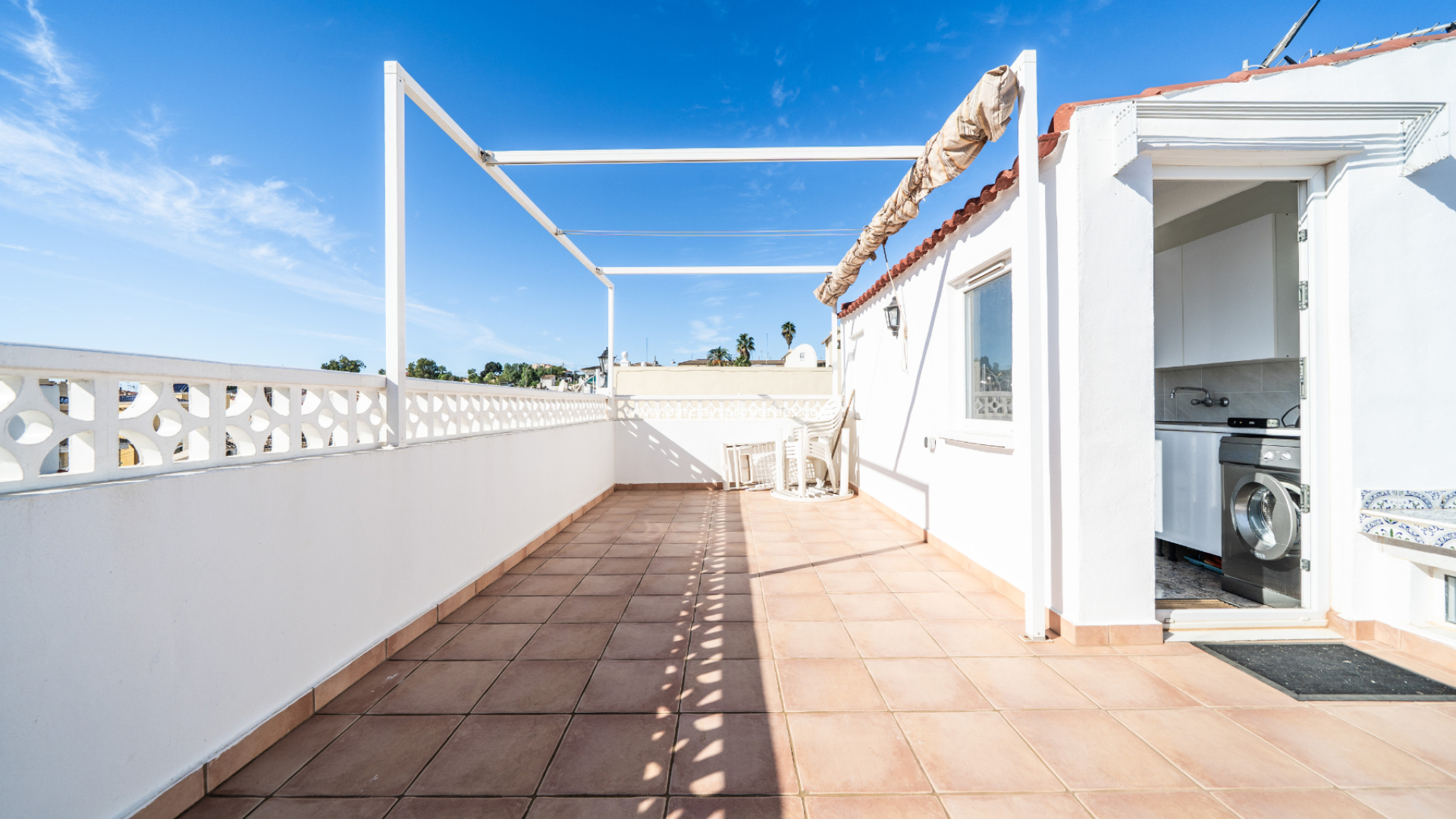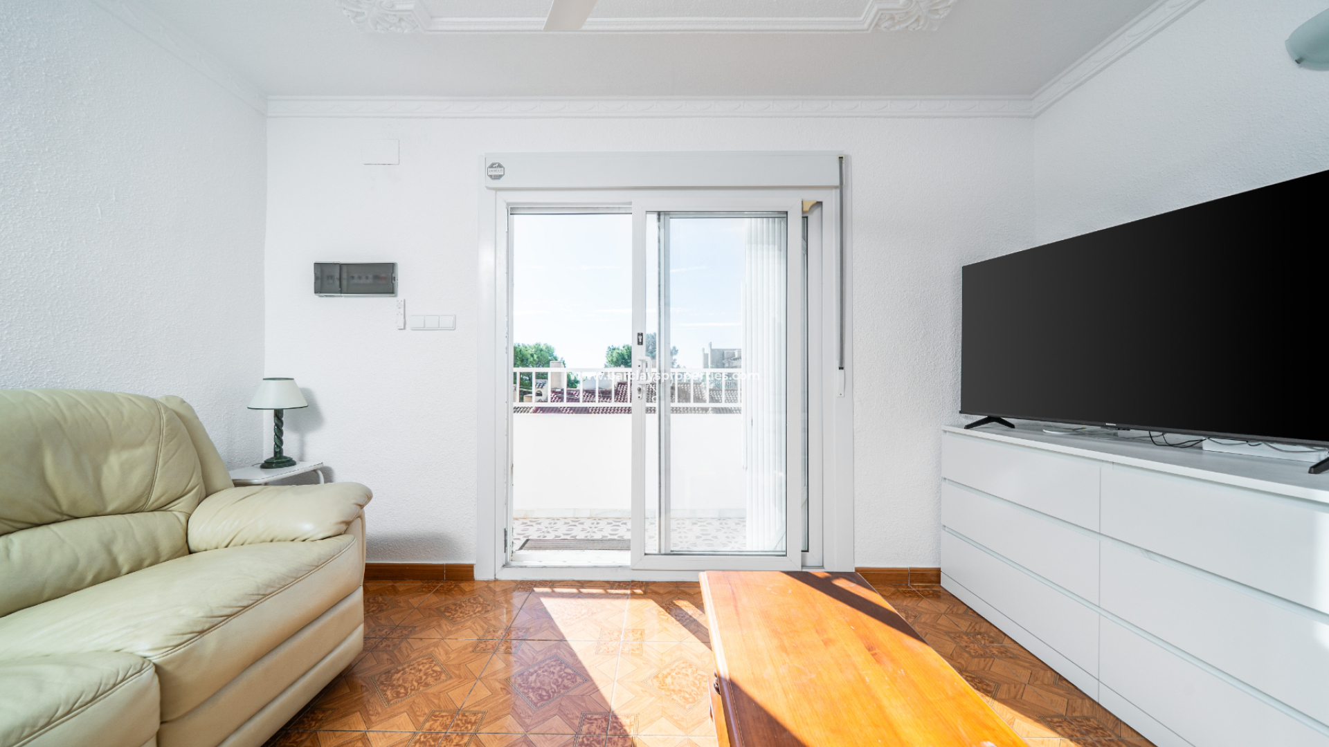 Trappor som finns på framsidan terrassen leder till den övre nivån av denna "Rosita", där vi hittar en solterrass och tillgång till insidan via skjutbara altandörrar. Denna nivå har ett ljust vardagsrum med ett öppet, nyrenoverat modernt kök, två sovrum och ett samtida badrum.