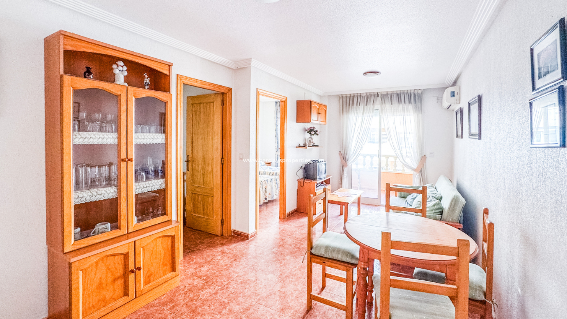 Bostaden har två sovrum – ett dubbelrum med inbyggd garderob och ett med två enkelsängar – samt ett välutrustat badrum med badkar, bidé, toalett och handfat. Vardagsrummet/matsalen har tillgång till en ✅privat balkong, perfekt för att njuta av den milda medelhavsbrisen. Det separata, fullt utrustade köket har en bakdörr som leder till en uteplats, vilket ger extra utrymme och praktisk användning.