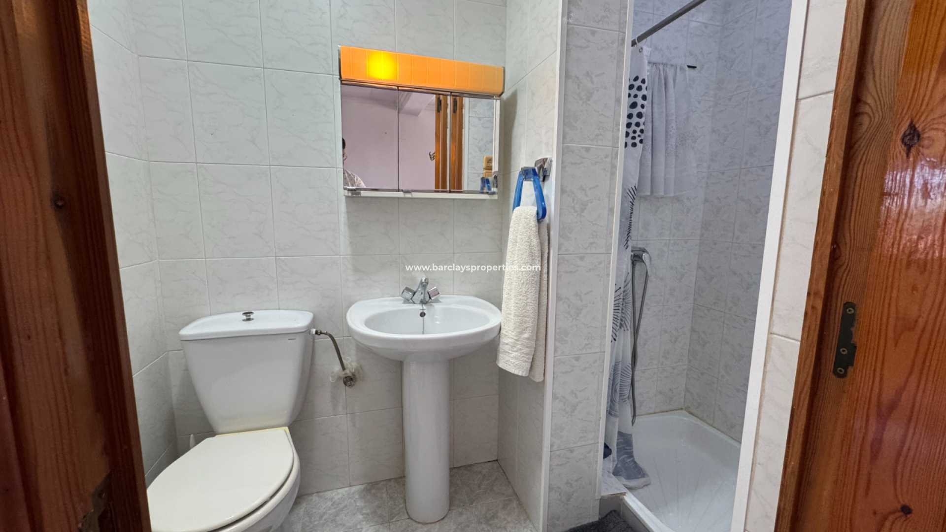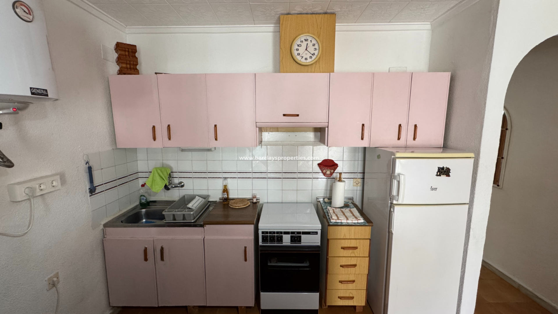 Fastigheten har en inglasad terrass som leder in till ett ljust vardagsrum och matplats med luftkonditionering. Det öppna köket inkluderar en gasspis och en nyligen installerad elpanna. Badrummet på bottenvåningen är utrustat med en duschkabin, toalett och handfat. Det utökade sovrummet på denna nivå inkluderar takfläkt och inbyggd skåpförvaring.