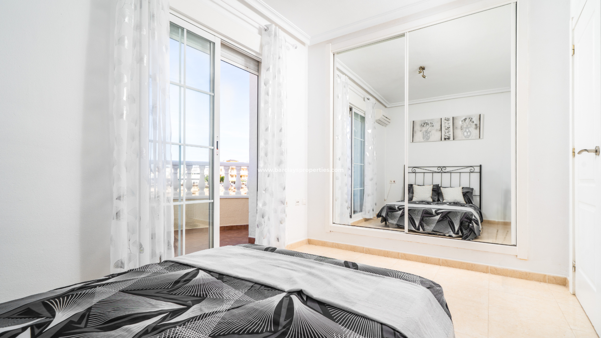 På övervåningen finns ytterligare två sovrum, alla med tillgång till en privat balkong, tillsammans med ett andra badrum. Villans läge ger gott om morgonsol och en ljusfylld atmosfär under hela dagen. Invånarna drar nytta av en vackert underhållen gemensam pool, perfekt för att koppla av eller tillbringa tid med familj och vänner under de varmare månaderna. Denna fastighet kombinerar en fridfull miljö med utmärkt tillgång till bekvämligheter och representerar också en fantastisk möjlighet för hyresinvestering.
