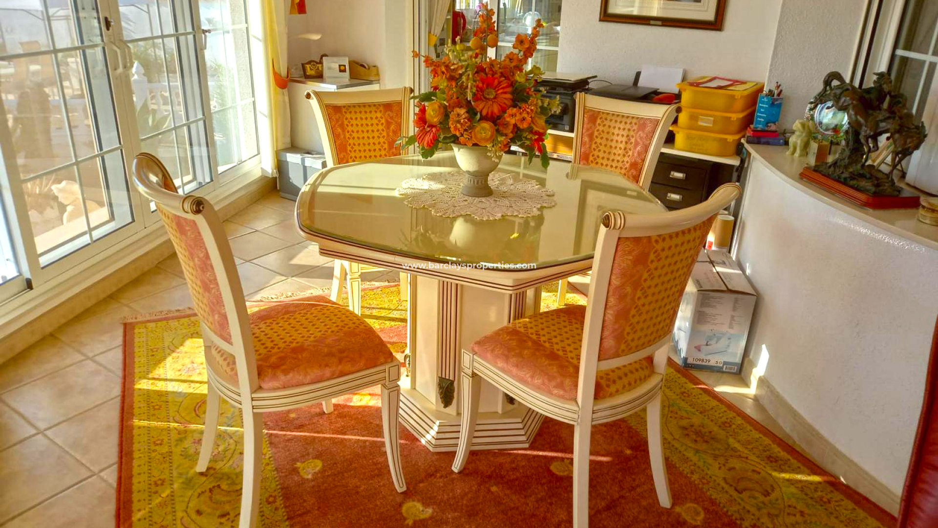 Vardagsrummet är ljust och bekvämt, förstärkt av ett upphöjt tornstak, gasbrasa, takfläkt och luftkonditionering. Layouten inkluderar fyra sovrum i huvudbyggnaden. Master-sovrummet har luftkonditionering, en takfläkt, en fyra-dörrars inbyggd garderob och ett en-suite badrum med badkar, separat dusch, WC, handfatsskåp, bidé och uppvärmd handdukstork. Det andra sovrummet är ett dubbelrum med luftkonditionering, en takfläkt och en fyra-dörrars inbyggd garderob. Det tredje är ett tvåbäddsrum med två inbyggda garderober och en takfläkt, medan det fjärde för närvarande används som ett omklädningsrum. Ett separat badrum med hörndusch, WC och handfatsskåp betjänar de extra sovrummen.