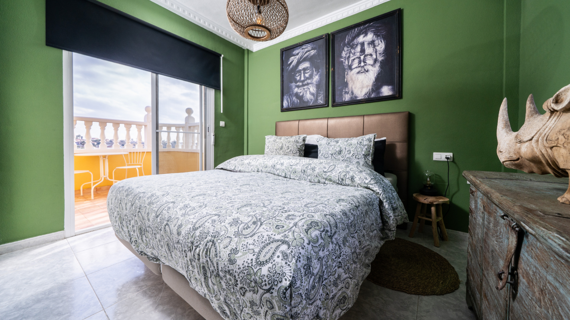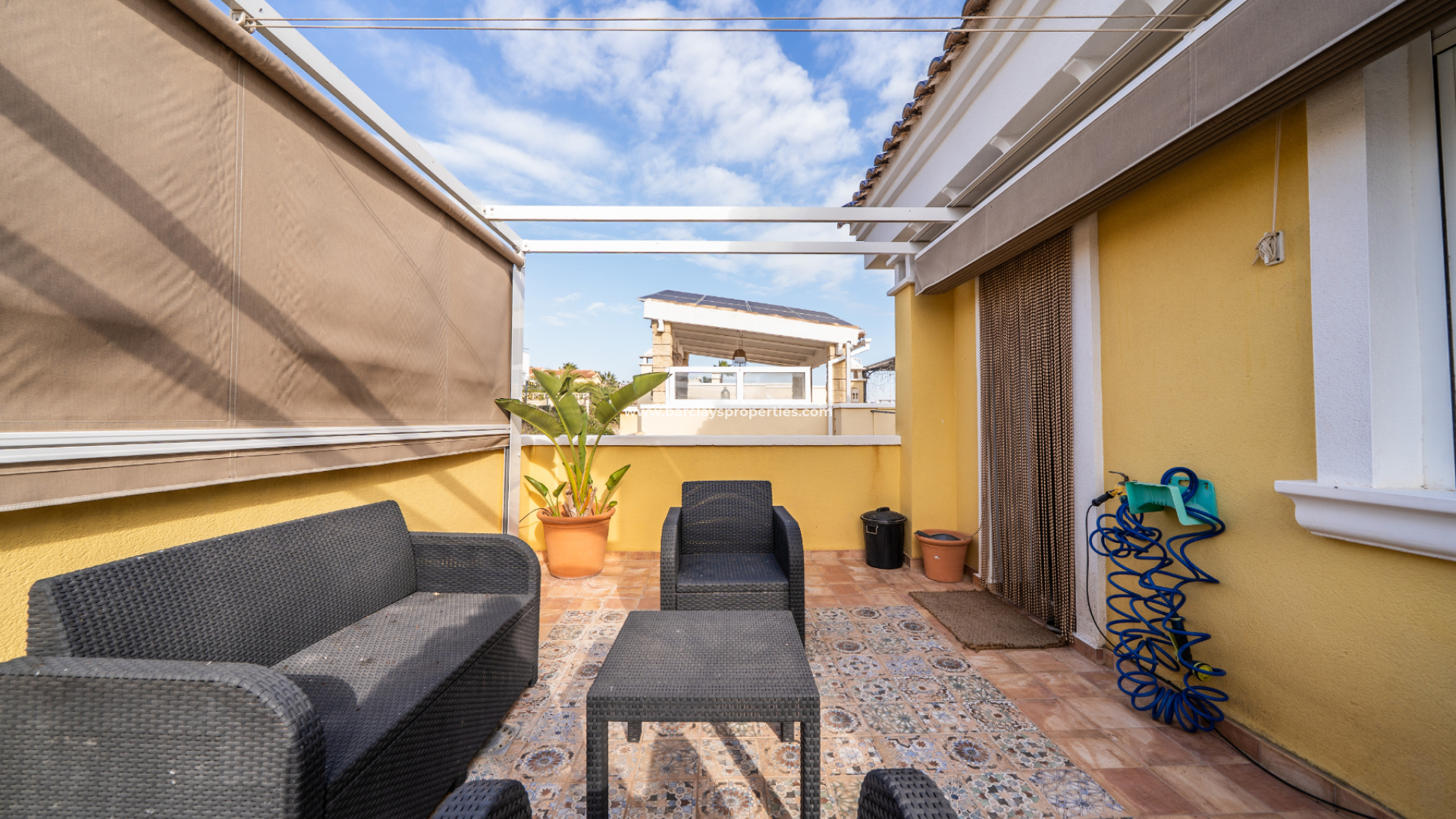 En intern trappa leder till ett ytterligare master bedroom samt ett badrum med walk-in-dusch, toalett och kommod. På denna våning finns en privat solterrass som erbjuder havsutsikt mot Guardamar och bortom den angränsande urbanisationen La Escuera. En bakre solterrass med markis finns också tillgänglig på detta plan.