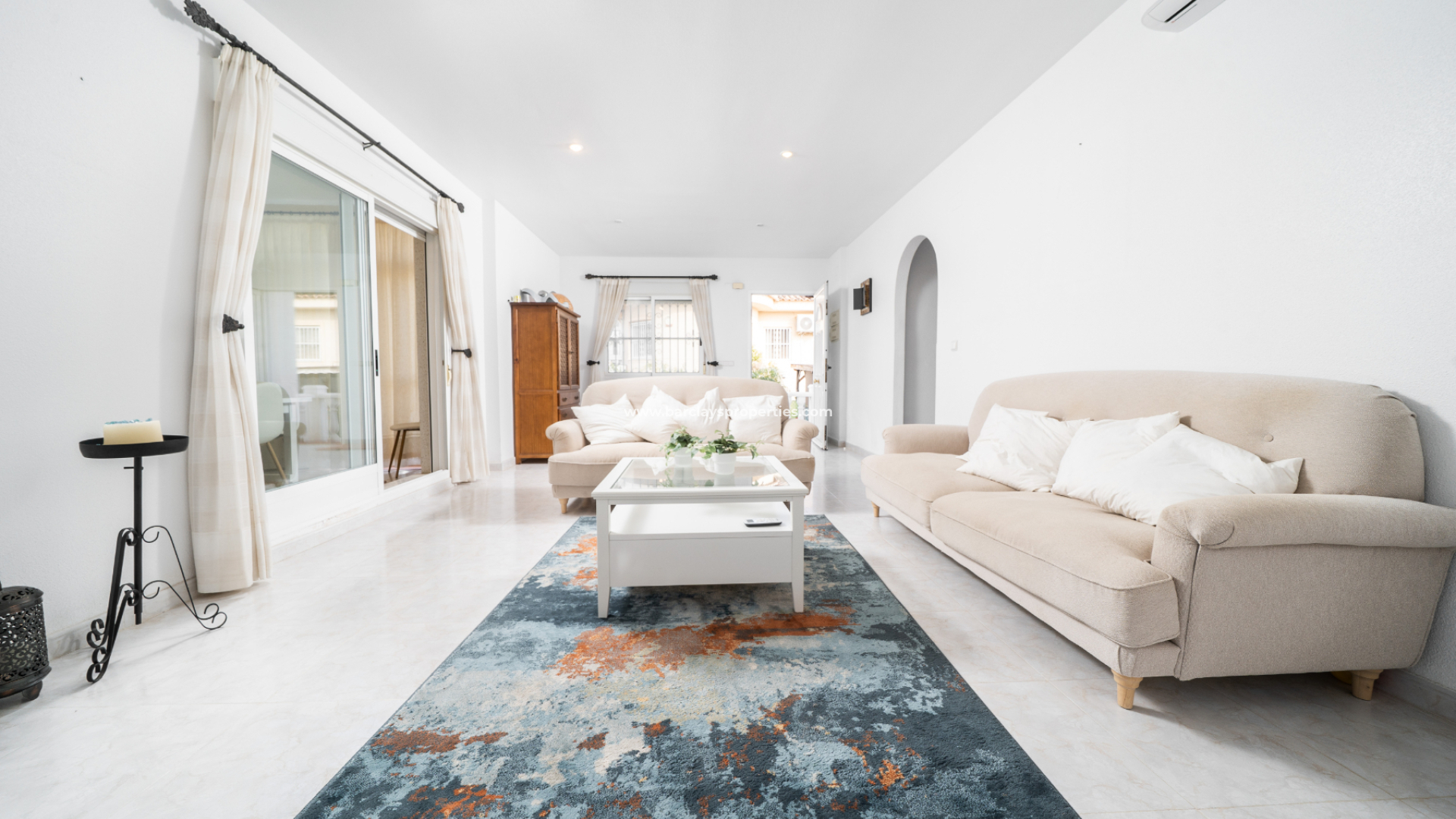 Denna helrenoverade fristående villa ligger i den populära urbanisationen La Marina, bara 5-10 minuters promenad från ett brett utbud av bekvämligheter. Den erbjuder rymligt boende och mångsidiga sällskapsytor, idealiska för både permanentboende och längre semestrar.