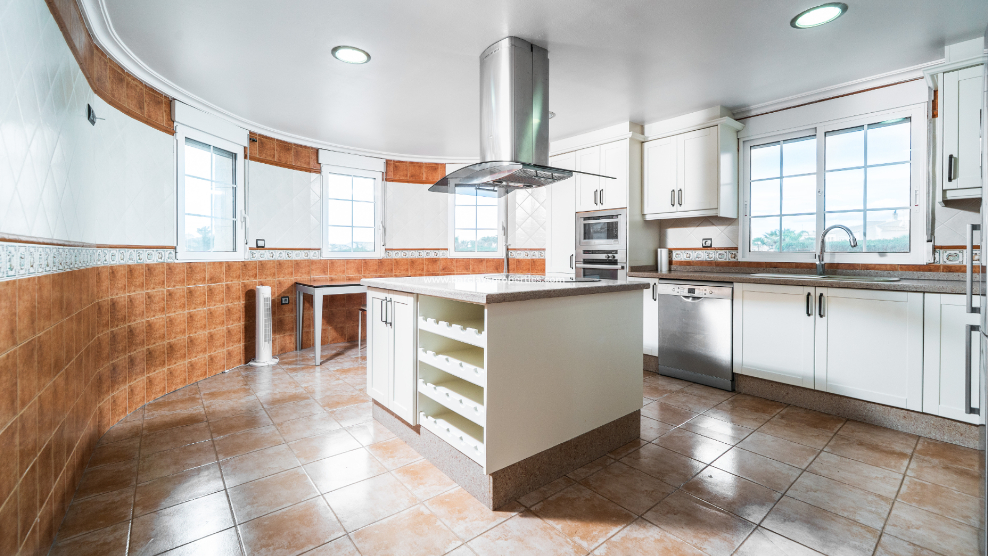 Det huvudsakliga vardagsrummet är ljust och rymligt, med högt i tak, laminatgolv och altandörrar som öppnas direkt mot uteterrassen. Det finns en definierad matplats och två luftkonditioneringsaggregat via kanaler, vilket skapar ett bekvämt utrymme för både vardagsliv och underhållning. Köket är välproportionerat med en stor köksö och elektriska apparater, kompletterat med en separat tvättstuga och skafferi som tillför värdefull förvaring och praktiska lösningar.