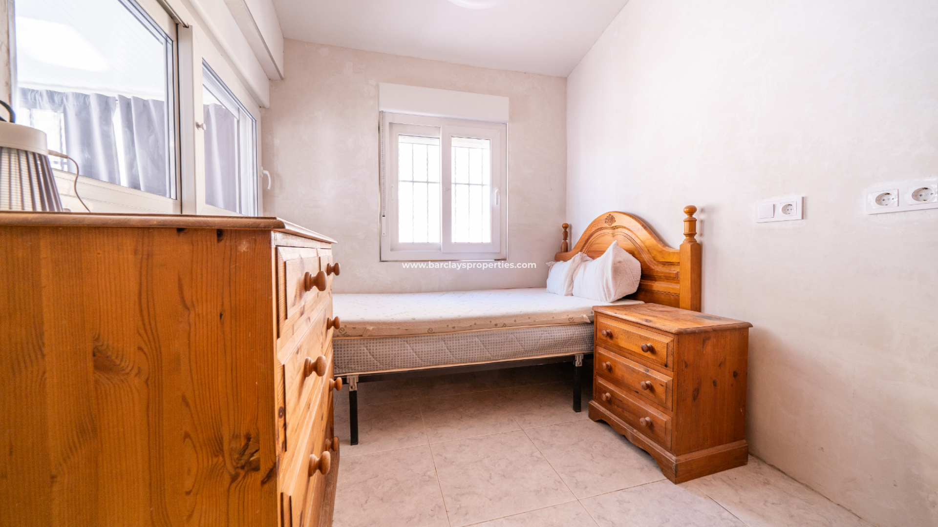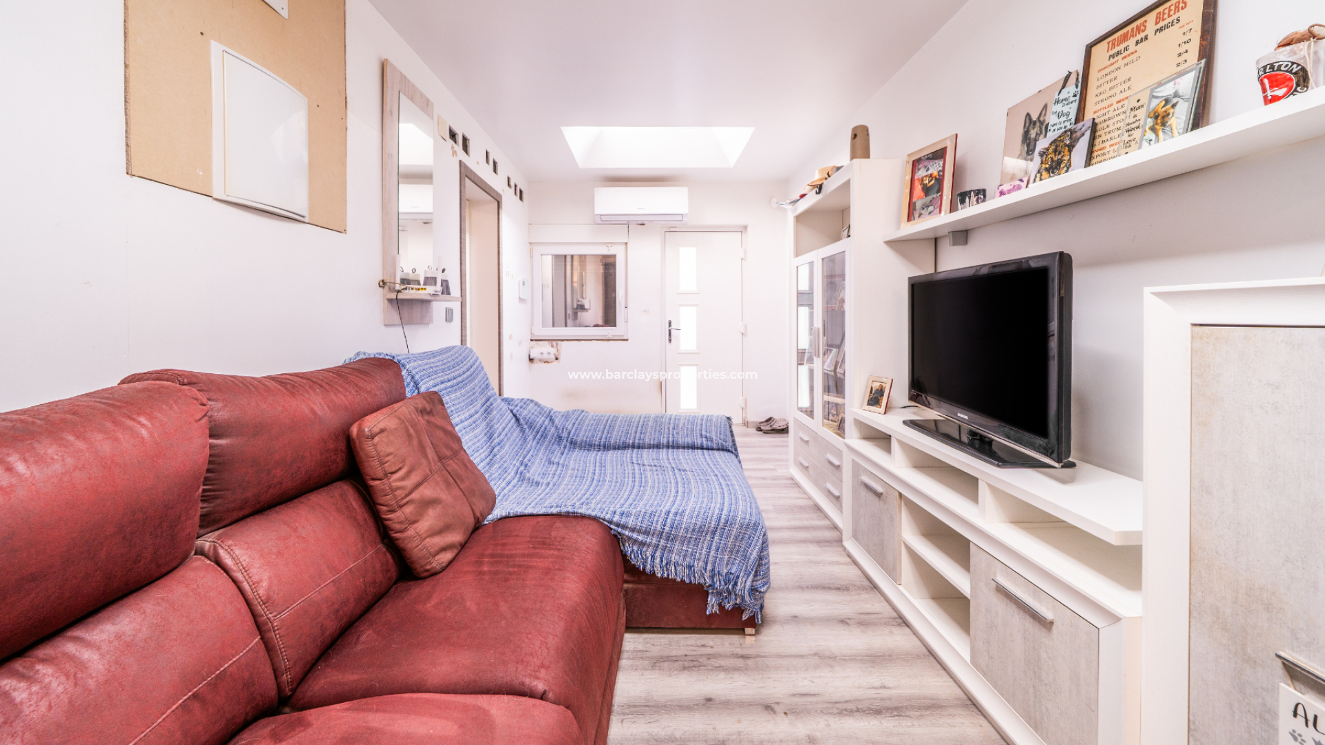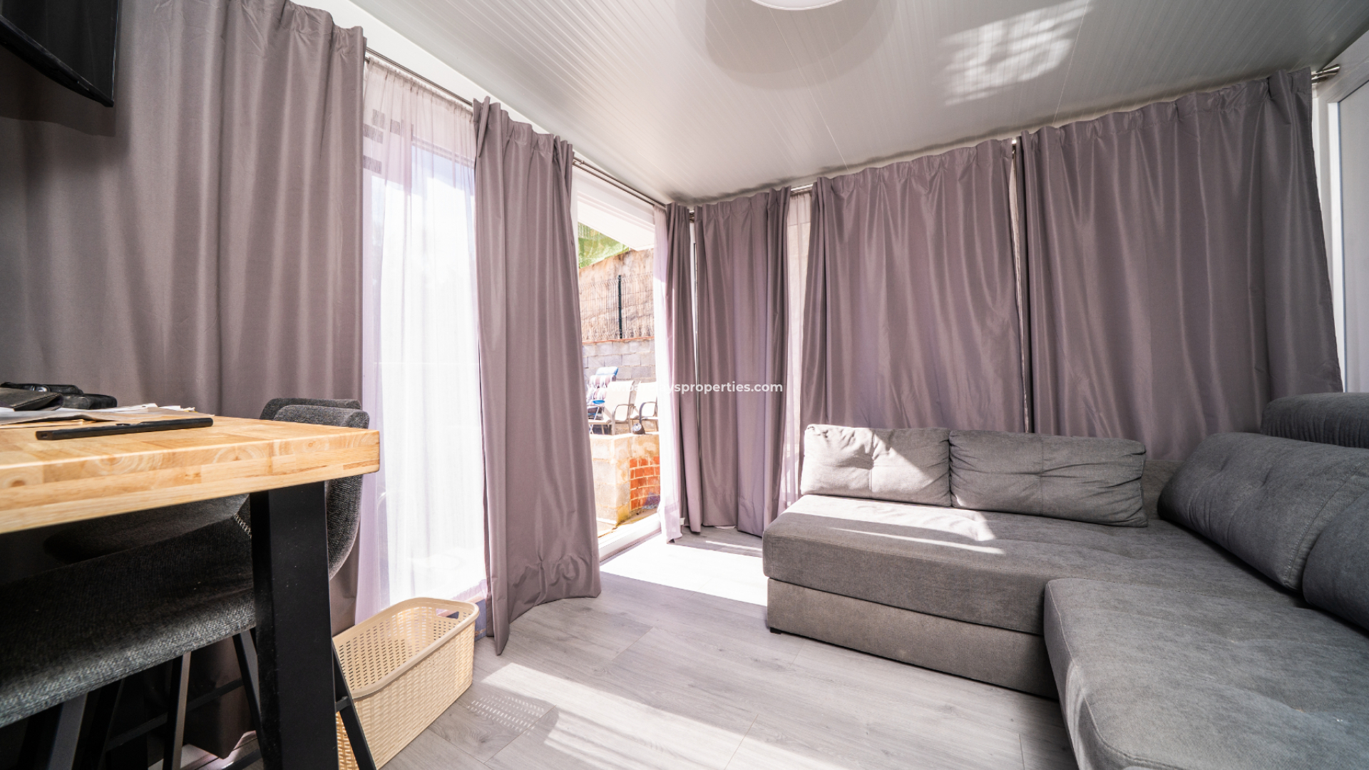 En praktisk ramp gör det enkelt för personer med nedsatt rörlighet att ta sig in i fastigheten. Inuti har vardagsrummet en modern stil som skapar ett ljust och välkomnande utrymme. Huvudsovrummet har luftkonditionering, takfläkt, klädkammare och ett eget badrum med dusch, WC och kommod. Det andra sovrummet är ett enkelrum med takfläkt.