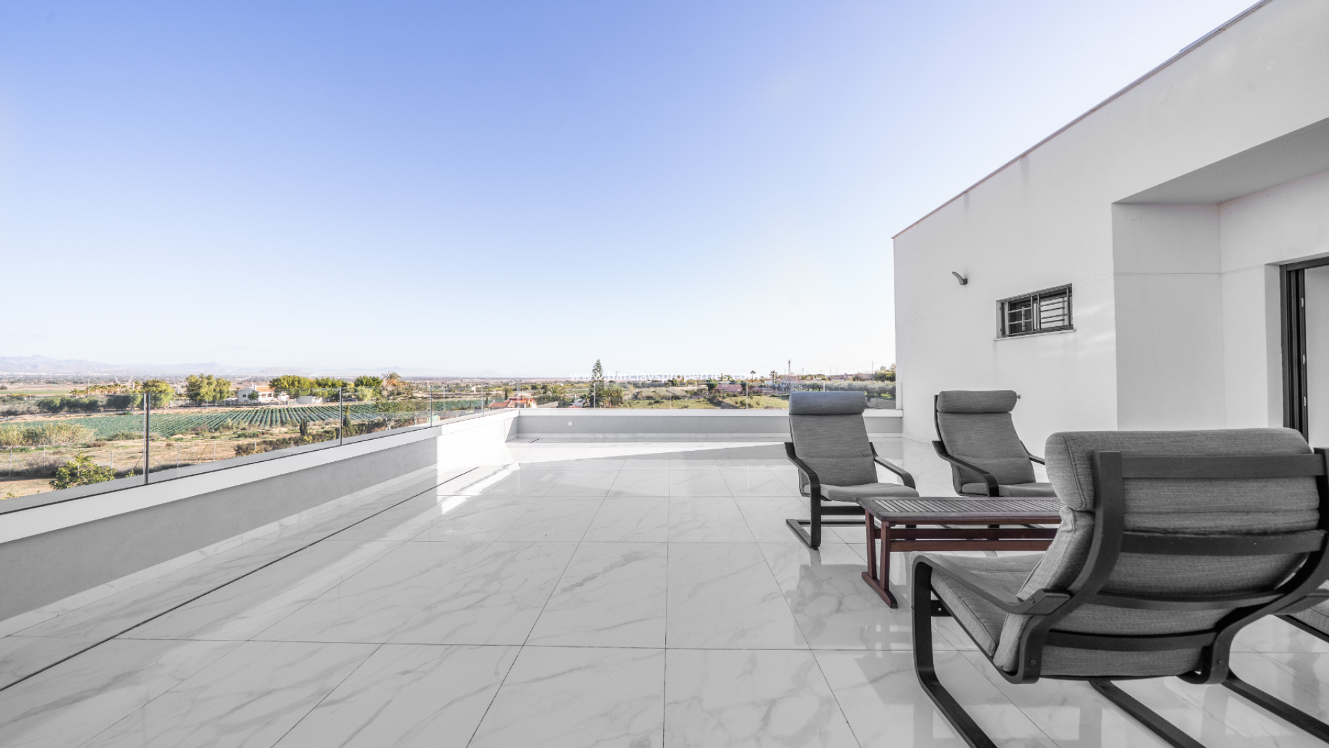 På övervåningen intar den imponerande mastersuiten en framträdande position med glas på två väggar, vilket förstärker känslan av rymd och koppling till det omgivande landskapet. Det egna badrummet inkluderar en stor walk-in-dusch, kommod och WC. Från denna nivå finns tillgång till en rymlig takterrass på 70 m², perfekt för att njuta av den öppna utsikten och utomhuslivet. Härifrån kan du njuta av den öppna vyn med ➡️ spektakulär utsikt över landsbygden och bergen och de mest fantastiska solnedgångarna.