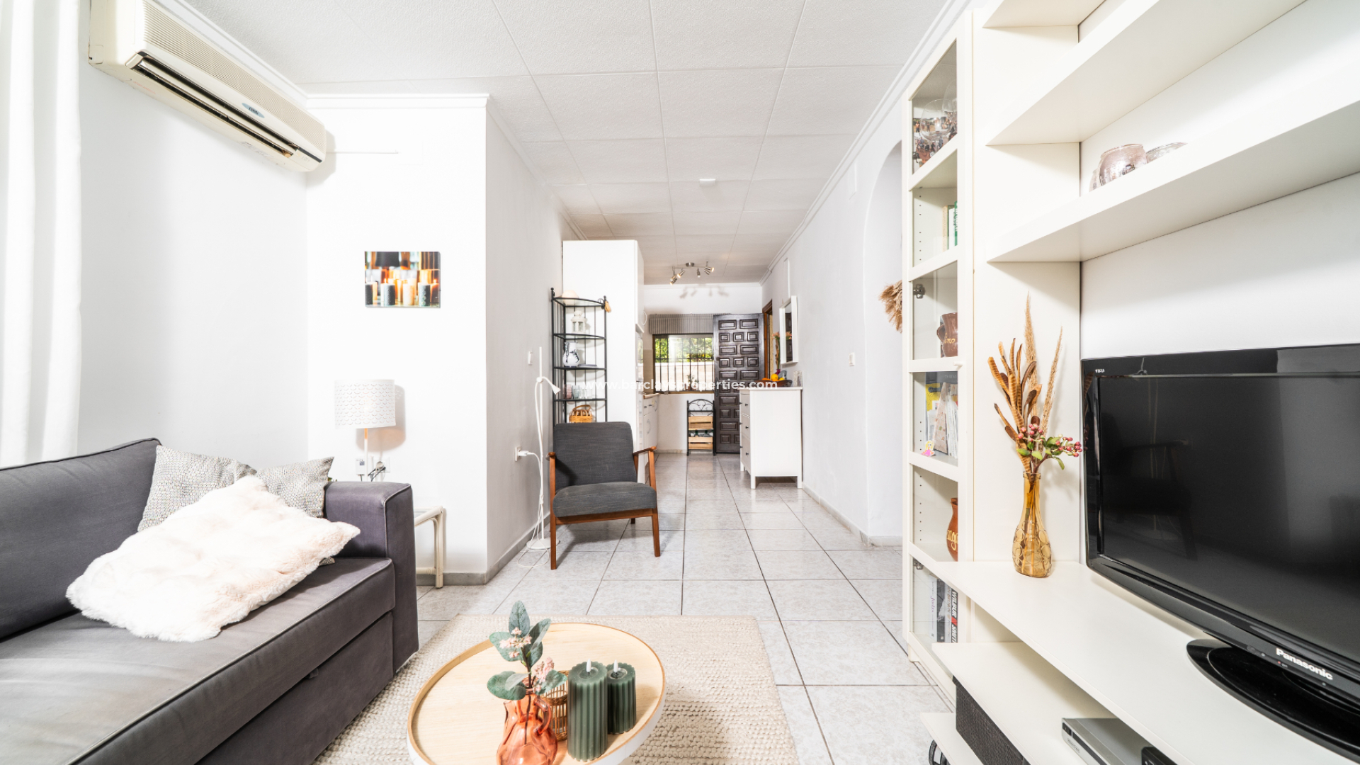 Fastigheten har två sovrum och ett badrum och har renoverats för att ge en fräsch och modern känsla genomgående. En inglasad veranda skapar en ljus och mångsidig entré, perfekt för avkoppling året runt. Inuti drar vardagsrummet nytta av luftkonditionering, vilket säkerställer komfort under de varmare månaderna, och leder till ett utrustat kök med gott om förvaring och arbetsytor.