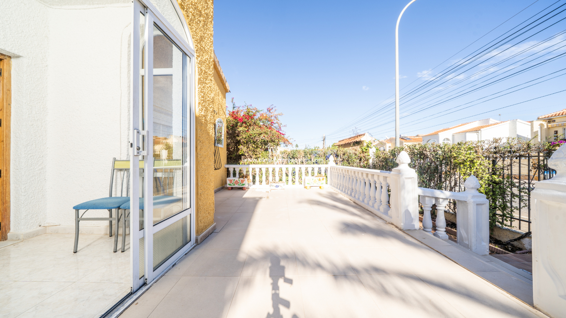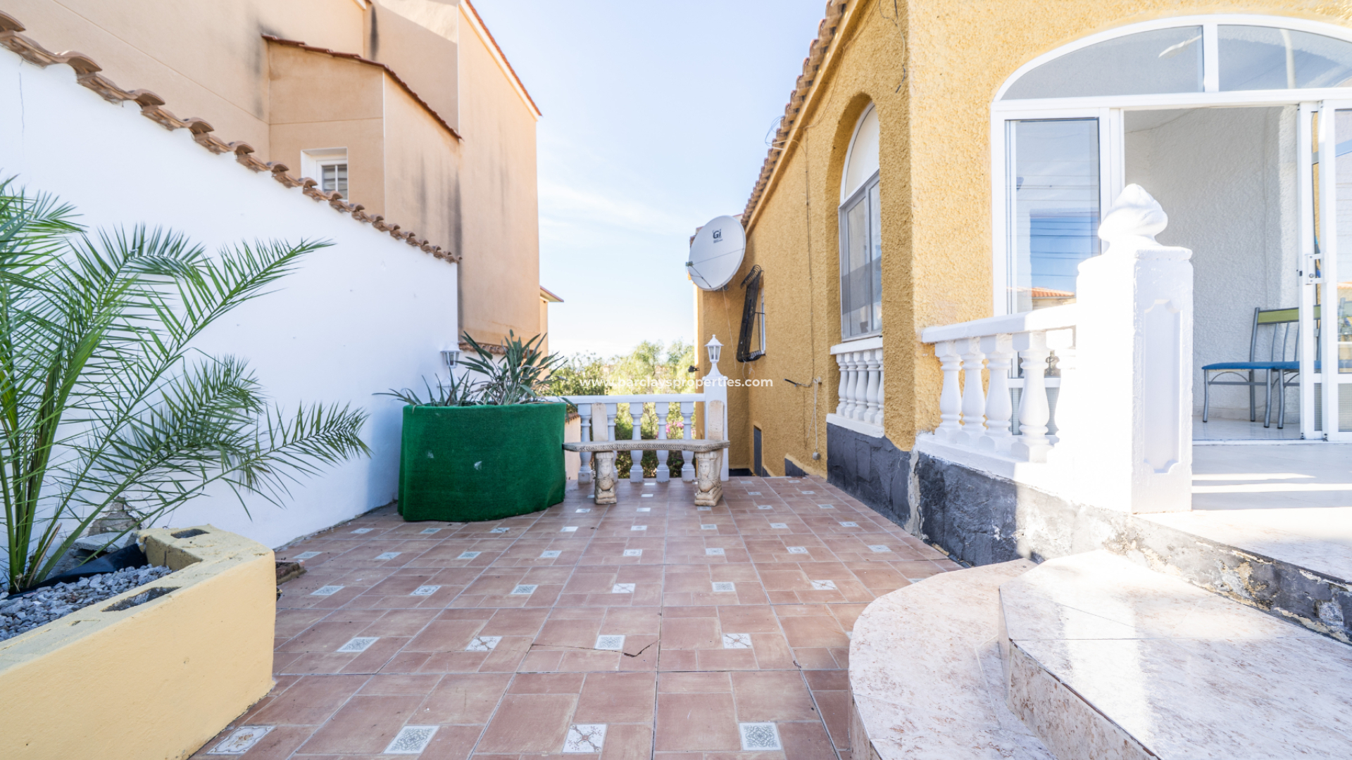 Fastigheten välkomnar dig med en generös solterrass på framsidan, prydd med eleganta balustrader och tillgänglig från flera punkter. Detta utomhusutrymme övergår i en ljus, inglasad veranda som för närvarande används som matplats, vilken fungerar som ingång till hemmet.