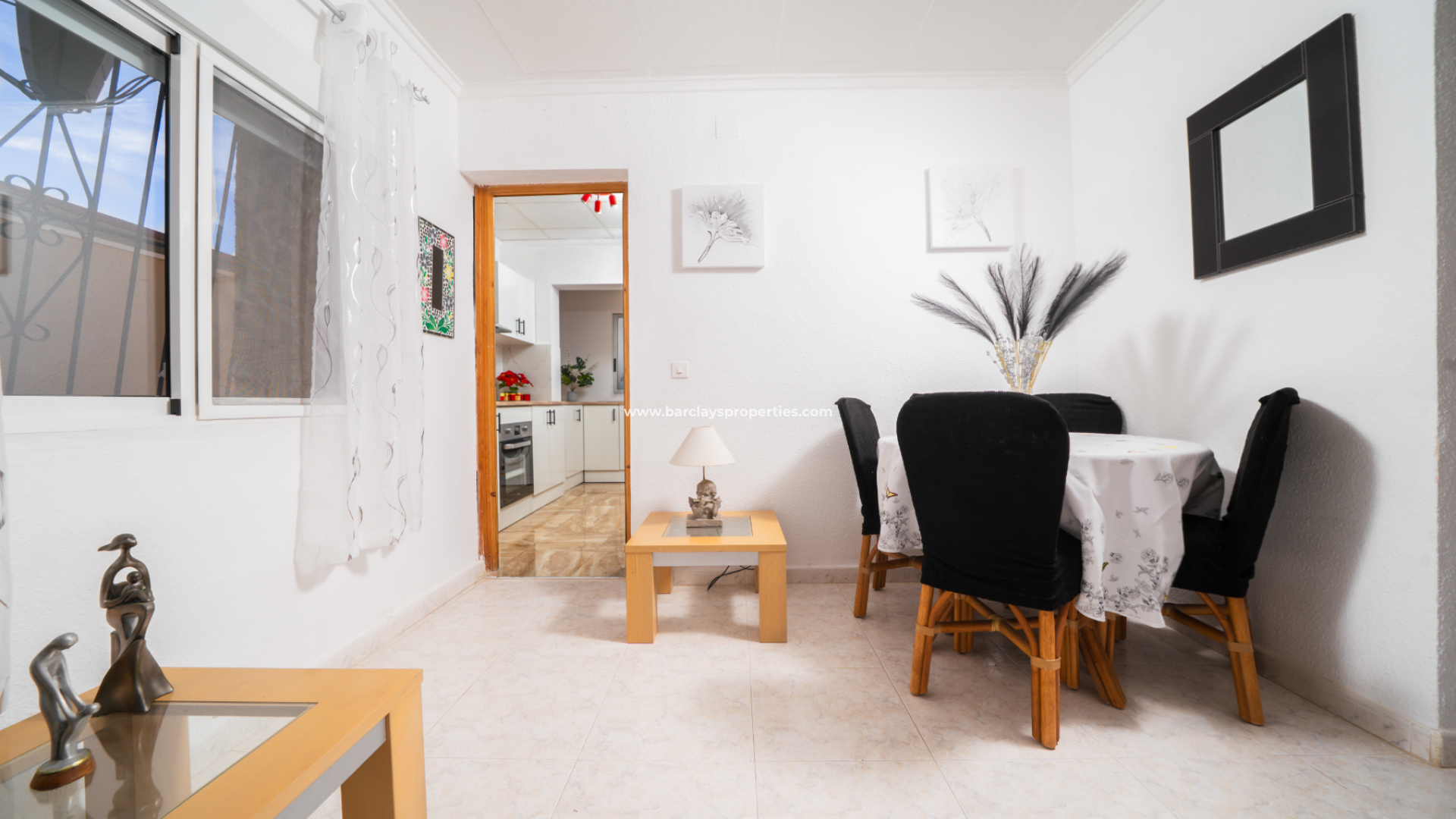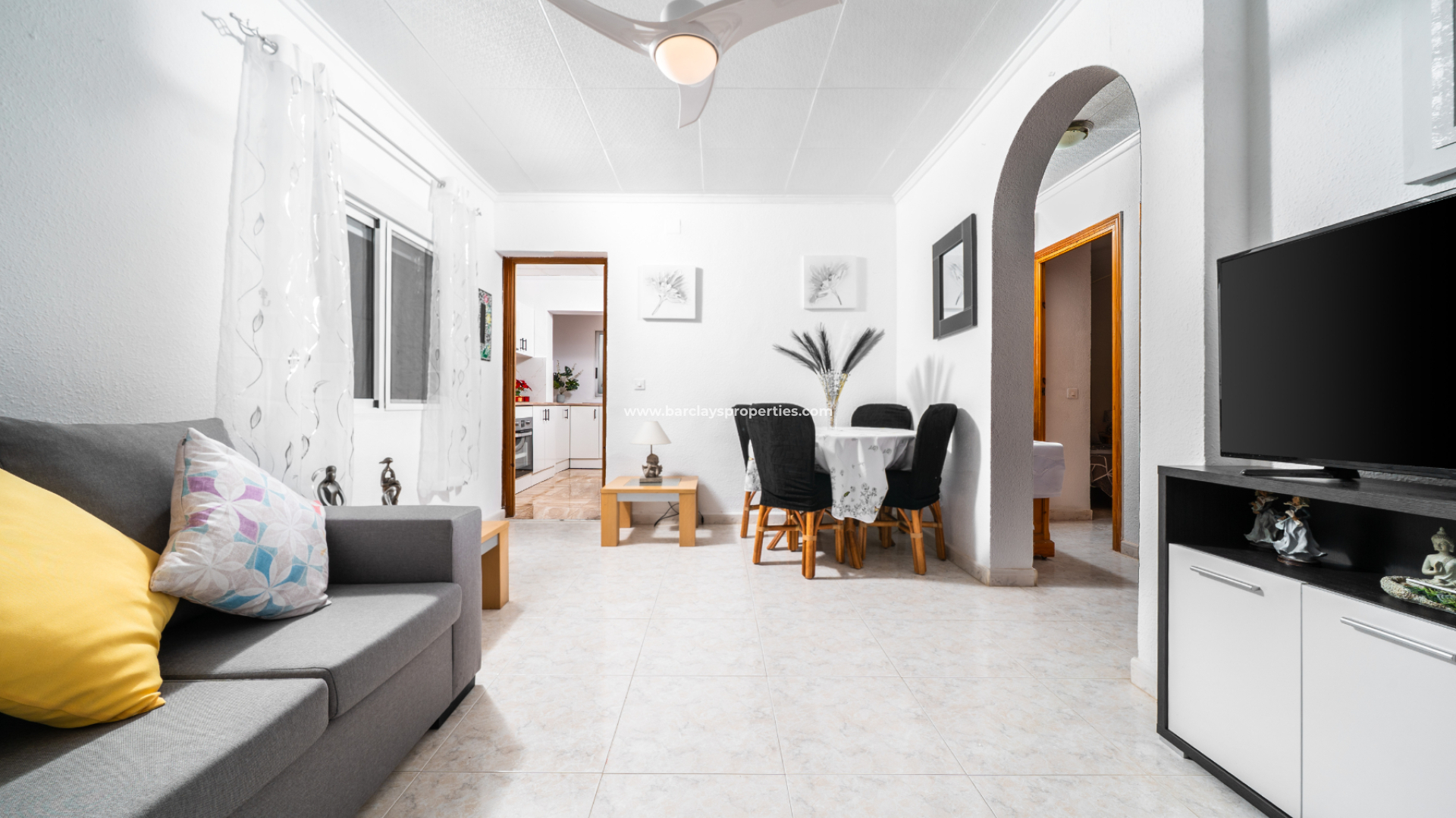Inuti är det inbjudande vardagsrummet utrustat med en takfläkt och en dedikerad matplats, som flyter sömlöst in i ett separat, moderniserat kök som känns både luftigt och rymligt.
