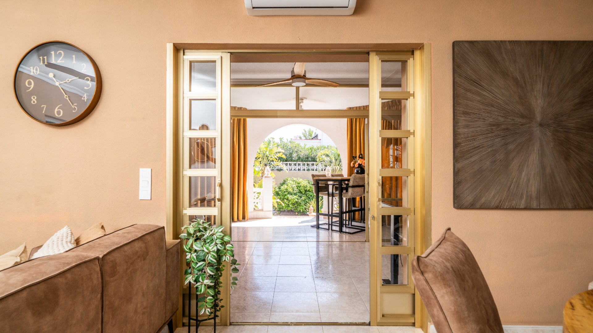 Detta hem välkomnar dig genom en hall som leder in till ett ljust vardagsrum och matplats, komplett med öppen spis, luftkonditionering och takfläktar för komfort året runt. Köket är väl tilltaget och har bänkskivor i marmor, gasspis och takfläkt, vilket ger en praktisk och stilfull plats för matlagning.