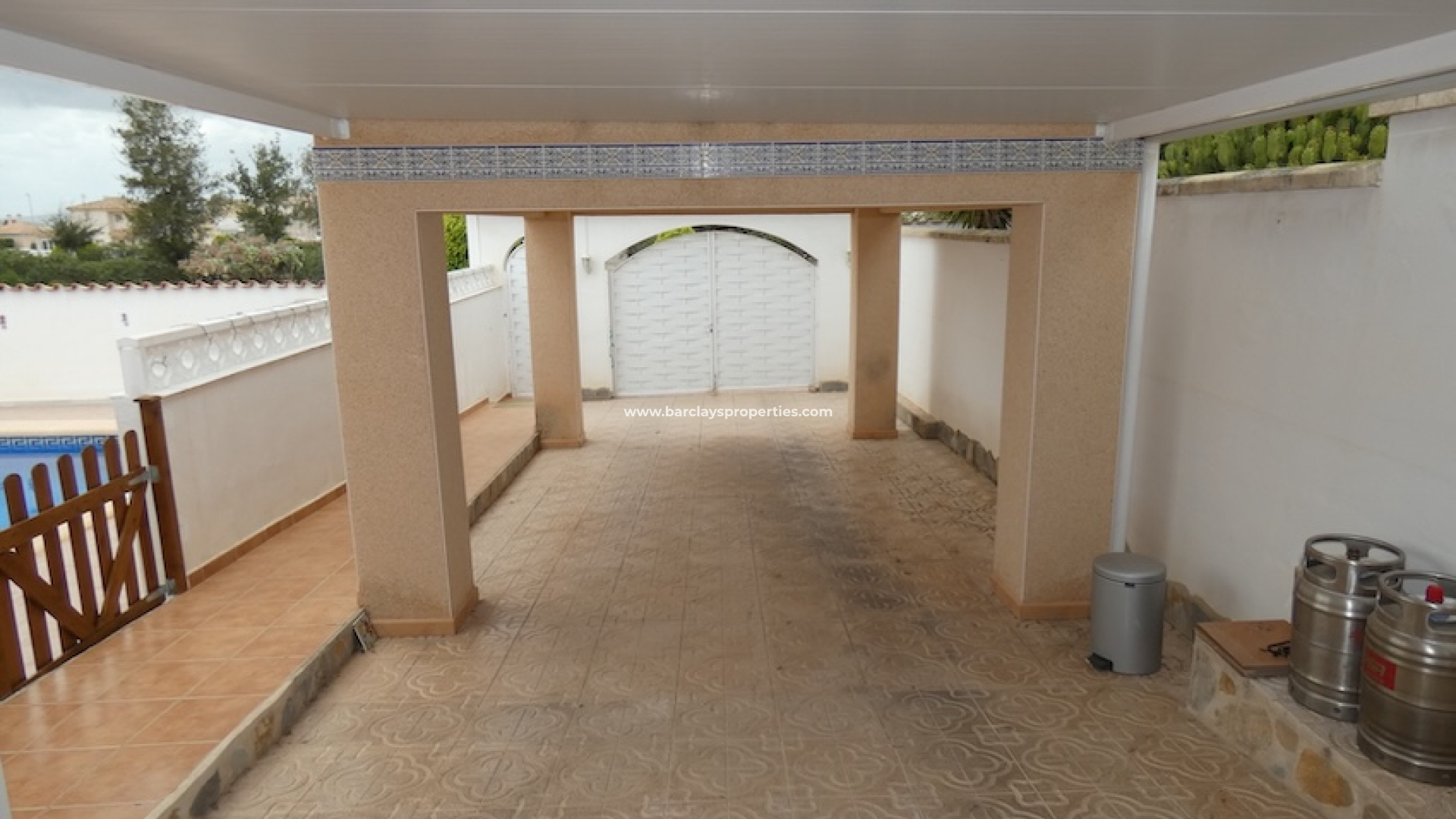 Poolområdet är helt kakelsatt och inhägnat, vilket säkerställer trygghet för barn och husdjur, med gott om utrymme för avkoppling i solen. En utomhusdusch, en grillyta och en dedikerad sittzon kompletterar anläggningen. En täckt terrass på sidan av fastigheten erbjuder en skuggig plats som kan nyttjas året runt. Resten av trädgården är planterad med ett urval av träd och buskar och täckt huvudsakligen av grus, vilket gör skötseln enkel.