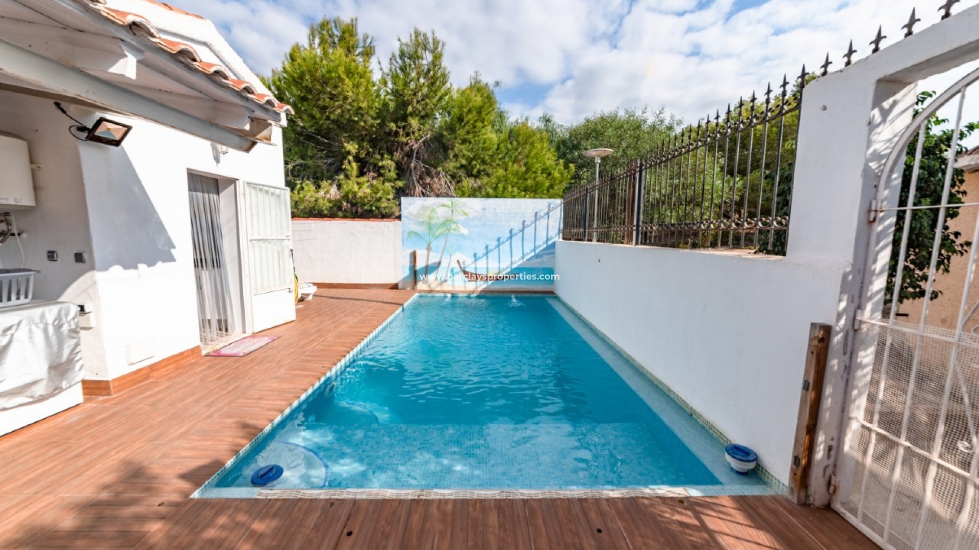Denna fastighet i västläge har en vacker trädgård som är perfekt för underhållning med familj och vänner, middag "al fresco" eller för cocktails i det täckta lusthuset. Du hittar ett vackert skuggat sommarkök med grill och angränsande matplats, ett bruksutrymme där pannan är inrymd, en mousserande privat pool och hela området är helkaklat i en dekorativ "terrass" stil för lågt underhåll.