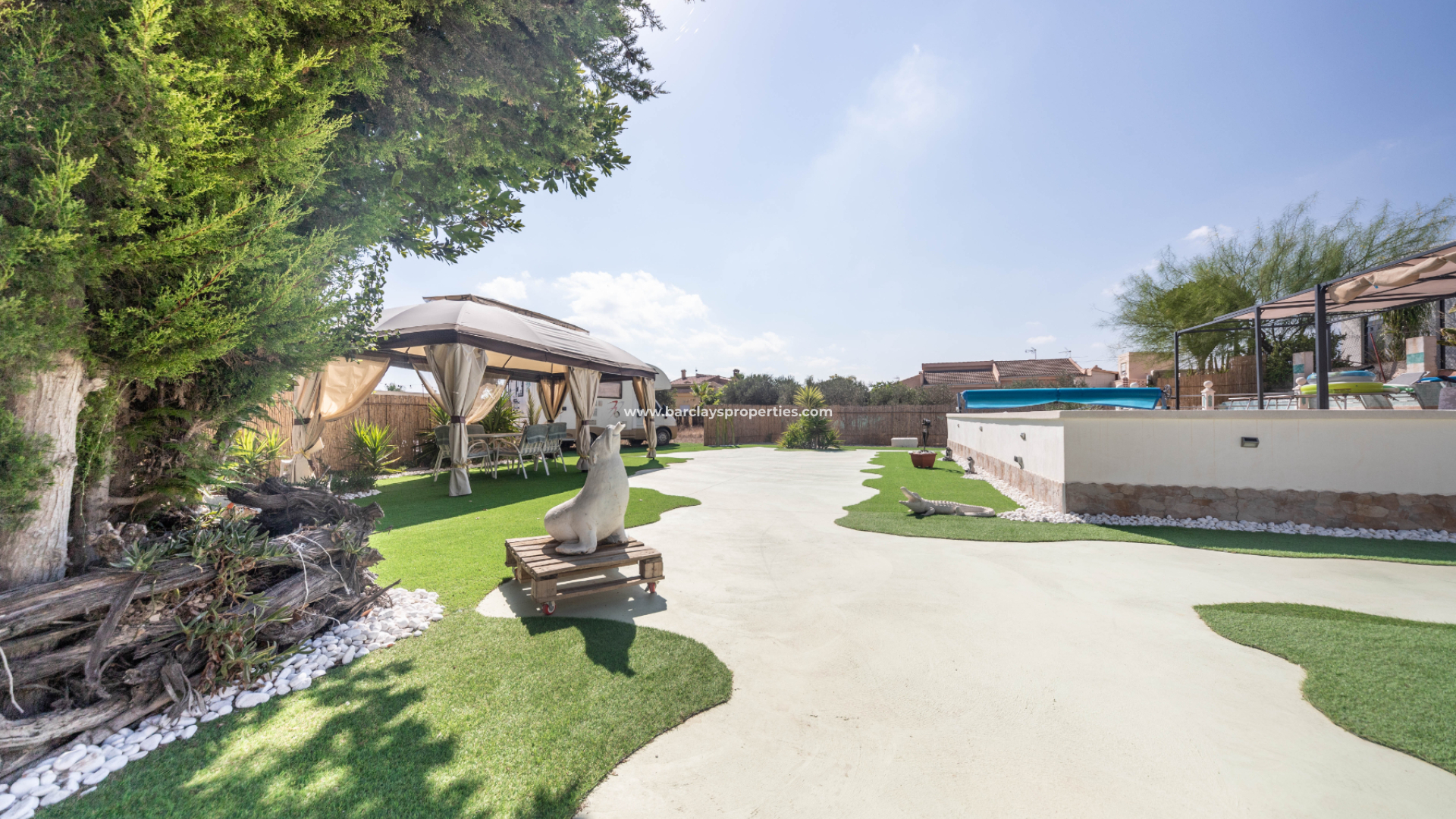 Den vackra 8 x 4 moderna saltvattenpoolen med ph-system är omgiven av olika täckta sittplatser, matplatser och solplatser, inklusive ett stort lusthus. Andra yttre områden på denna tomt är förvaringsskjul, förråd för trä, mark med olika fruktträd som oliver, fikon, apelsin-, citron- och päronträd.
