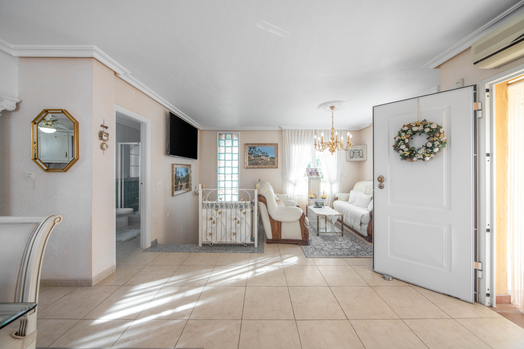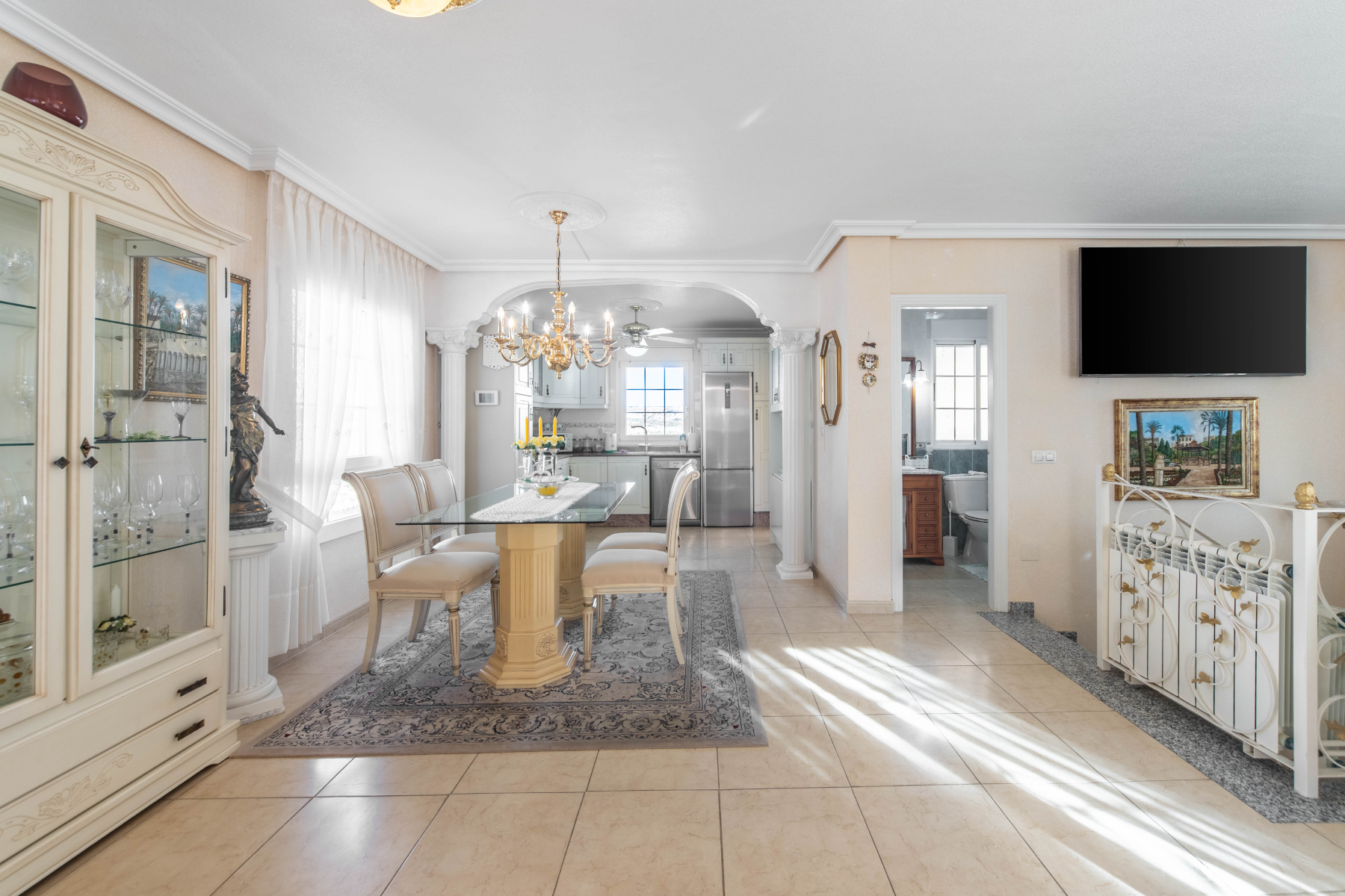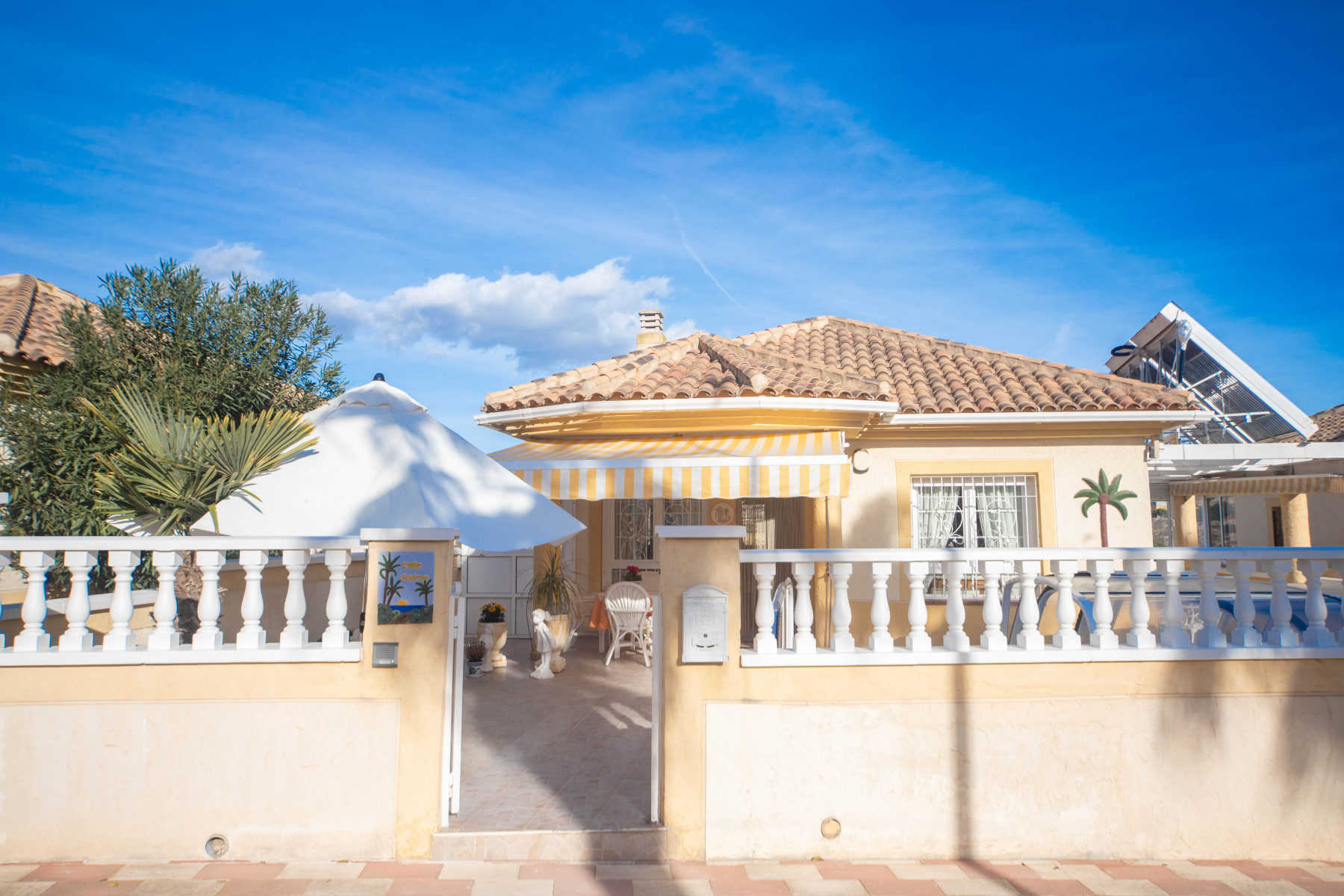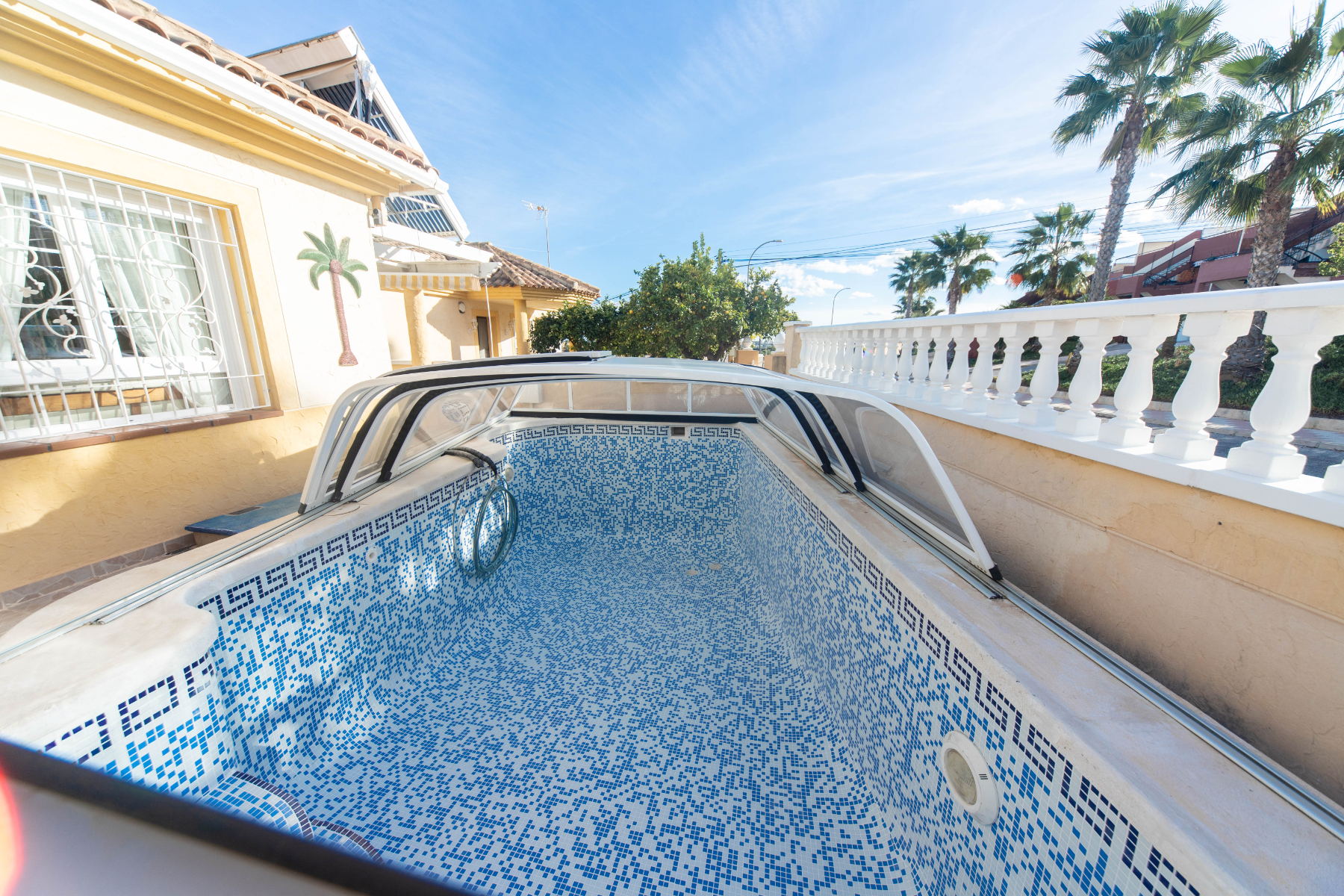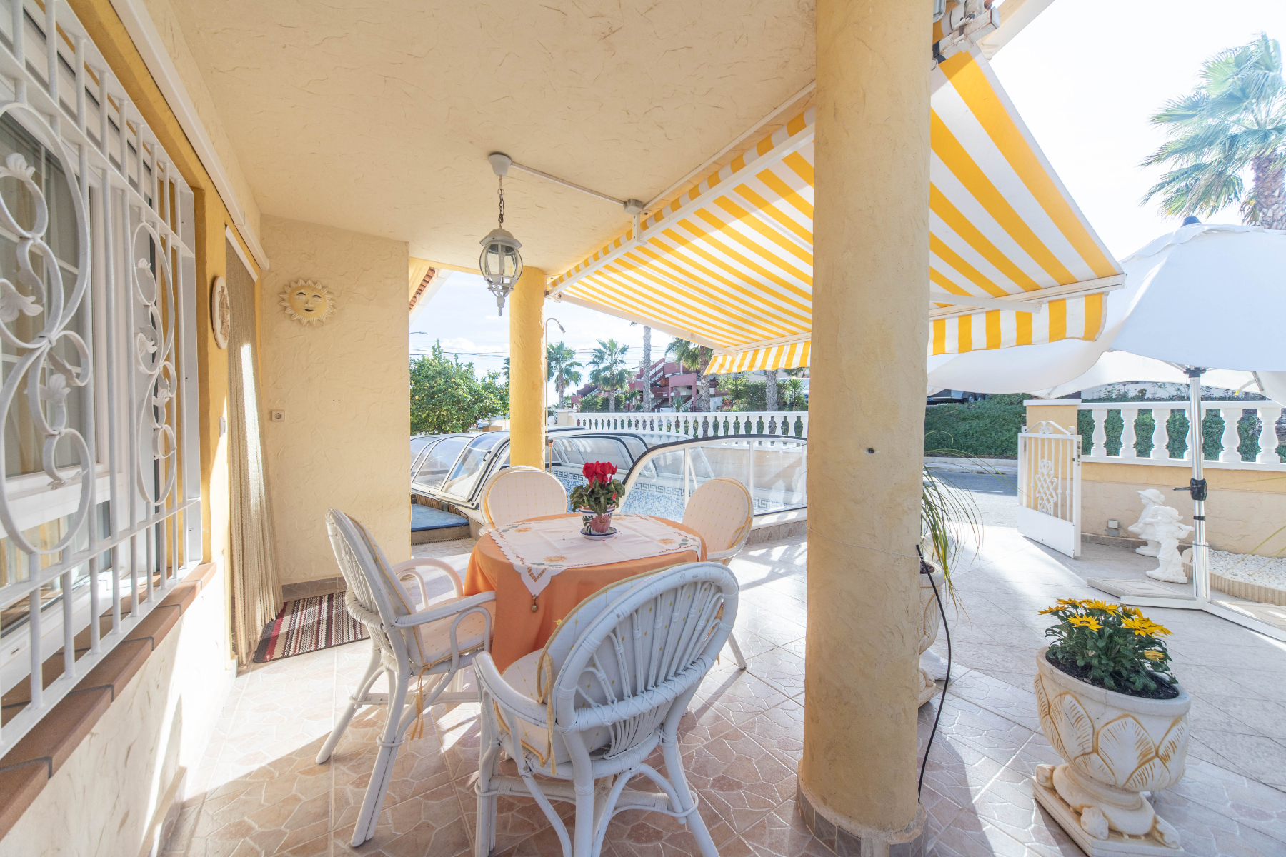 Här presenteras denna villa till salu i La Marina, som ligger i ett lugnt område i La Marina Urbanisation men ändå bara en kort promenad från de närmaste bekvämligheterna. På fastighetens översta våning hittar vi huvudentrén, men inte innan vi passerar genom den prydligt stenlagda trädgården med en egen 6,5 gånger 3,5 meter stor täckt uppvärmd pool! Solmarkiserna precis ovanför verandans funktionella pelare ger extra skugga till denna lummiga exteriör. Det finns en täckt sittplats vid poolen med vacker utsikt över landsbygden och en annan sittplats på framsidan av fastigheten, så att du kan följa det varma medelhavssolskenet hela dagen.