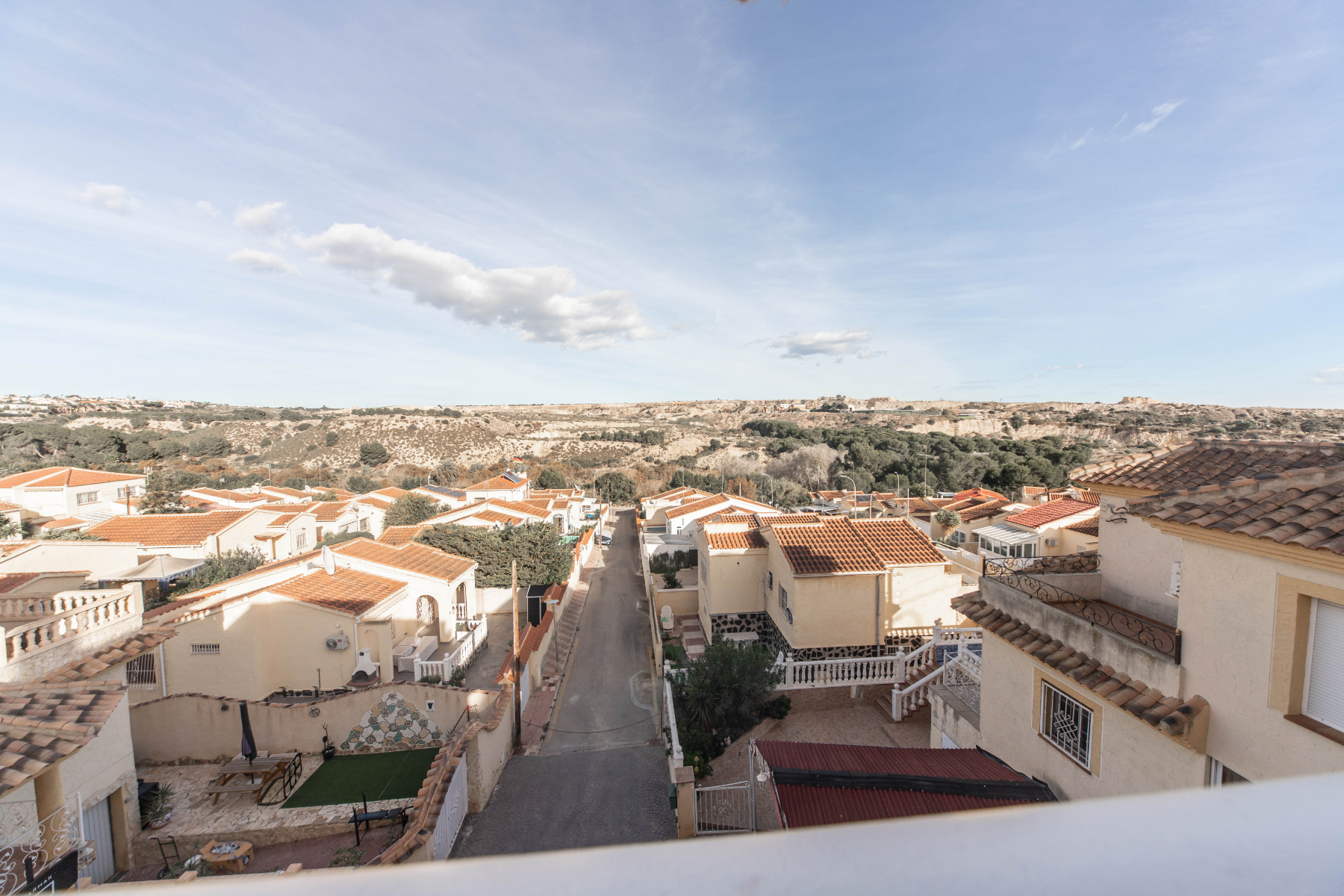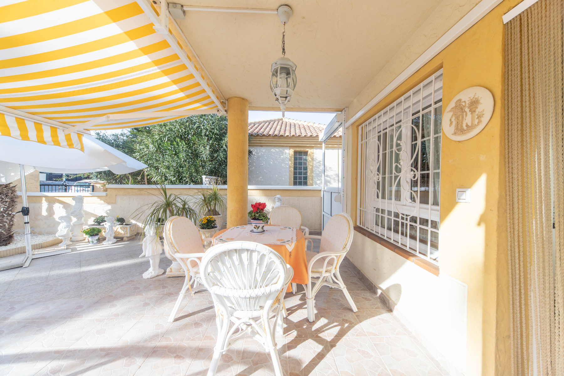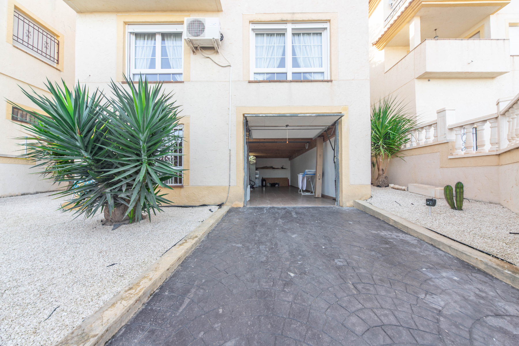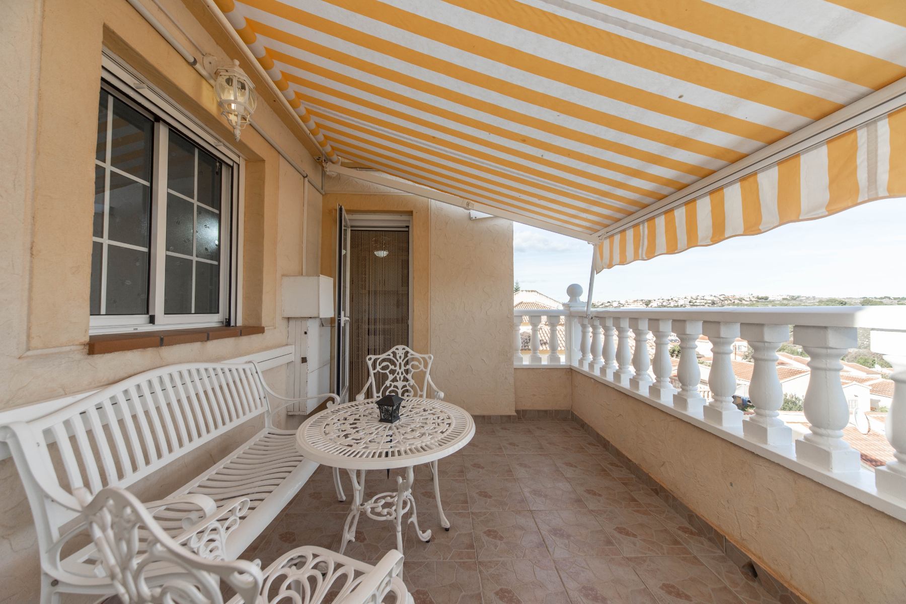 Här presenteras denna villa till salu i La Marina, som ligger i ett lugnt område i La Marina Urbanisation men ändå bara en kort promenad från de närmaste bekvämligheterna. På fastighetens översta våning hittar vi huvudentrén, men inte innan vi passerar genom den prydligt stenlagda trädgården med en egen 6,5 gånger 3,5 meter stor täckt uppvärmd pool! Solmarkiserna precis ovanför verandans funktionella pelare ger extra skugga till denna lummiga exteriör. Det finns en täckt sittplats vid poolen med vacker utsikt över landsbygden och en annan sittplats på framsidan av fastigheten, så att du kan följa det varma medelhavssolskenet hela dagen.