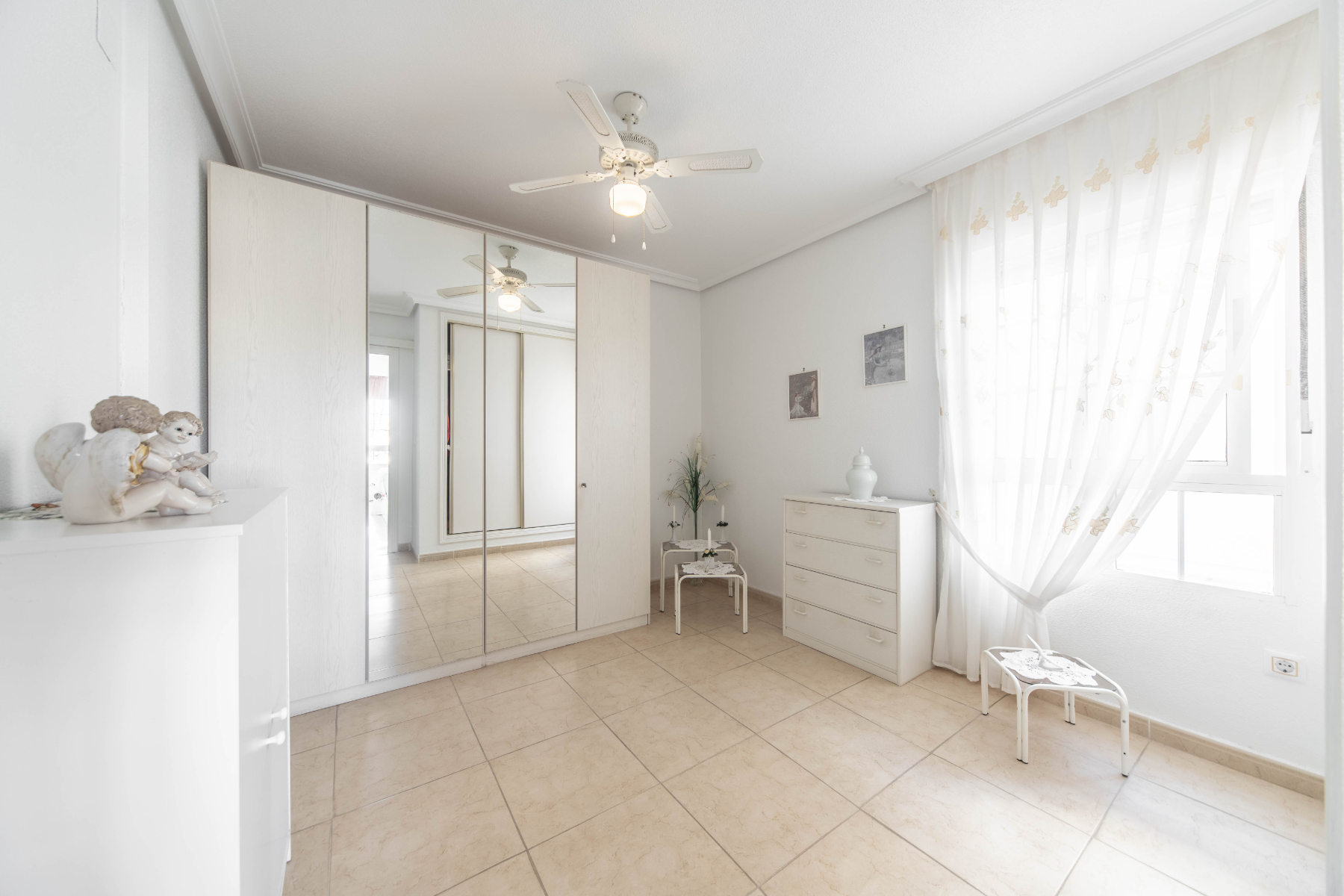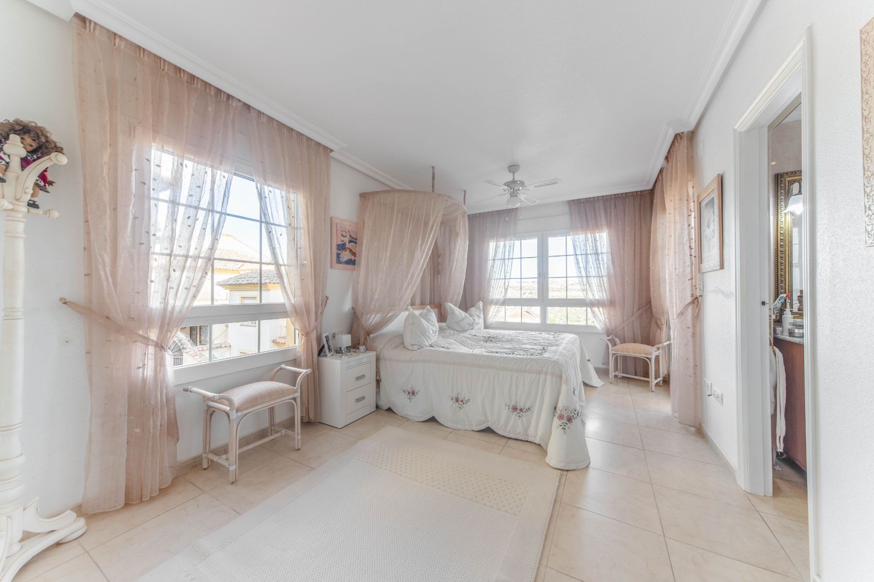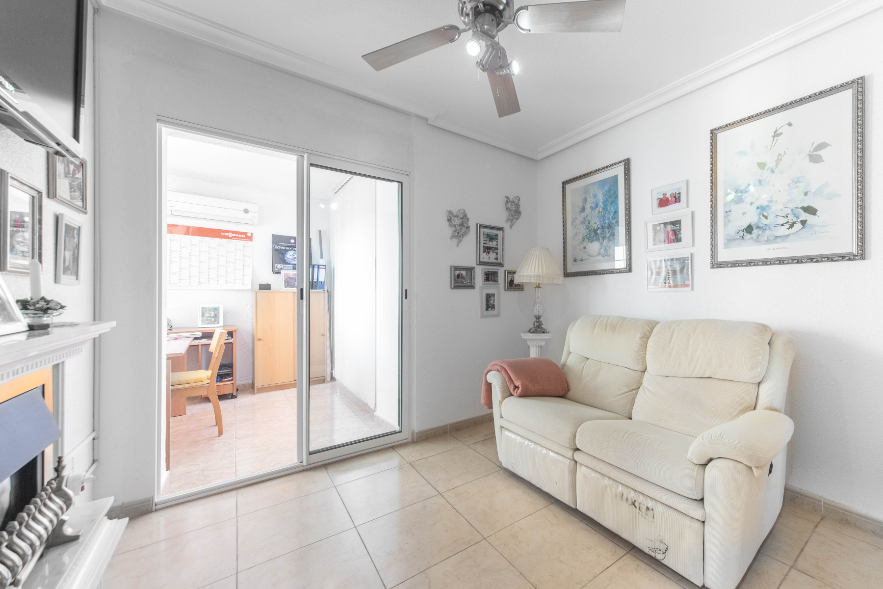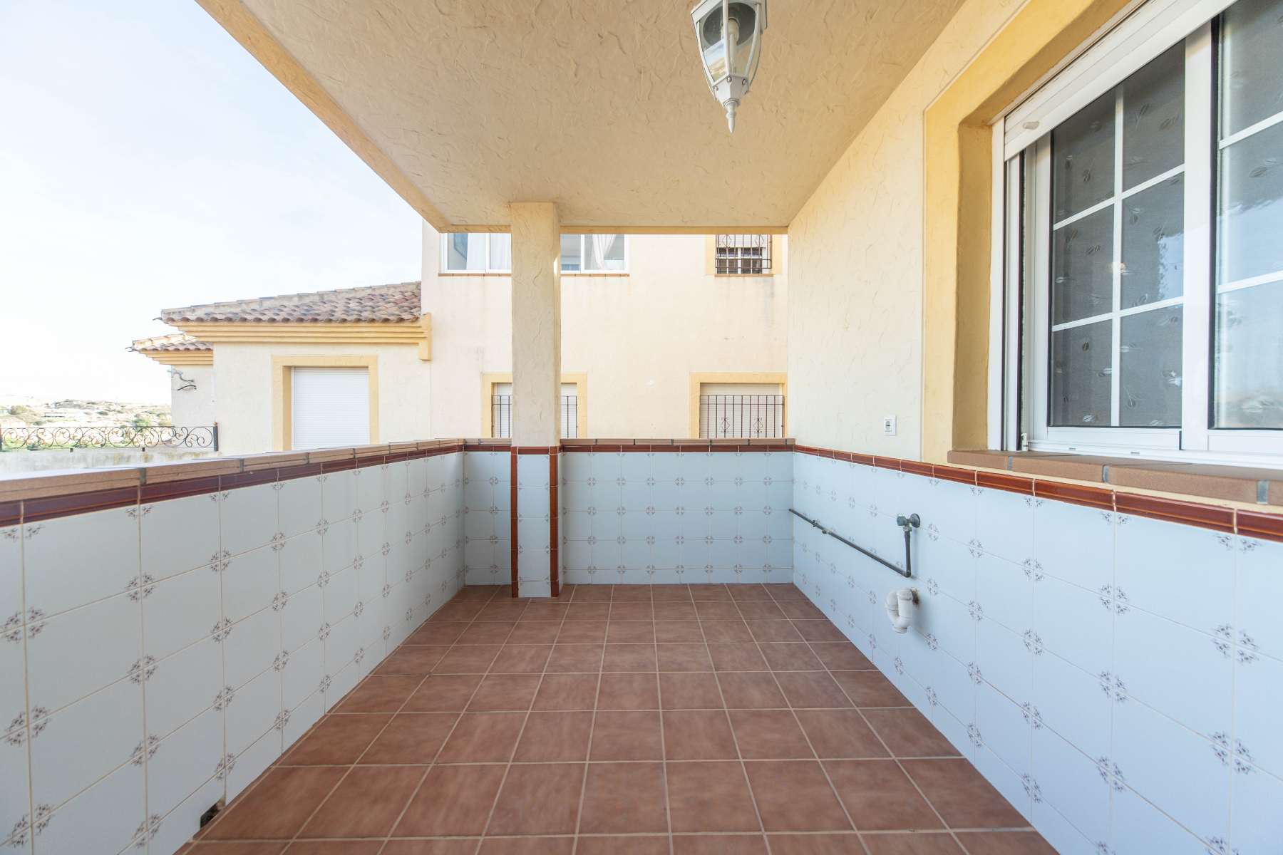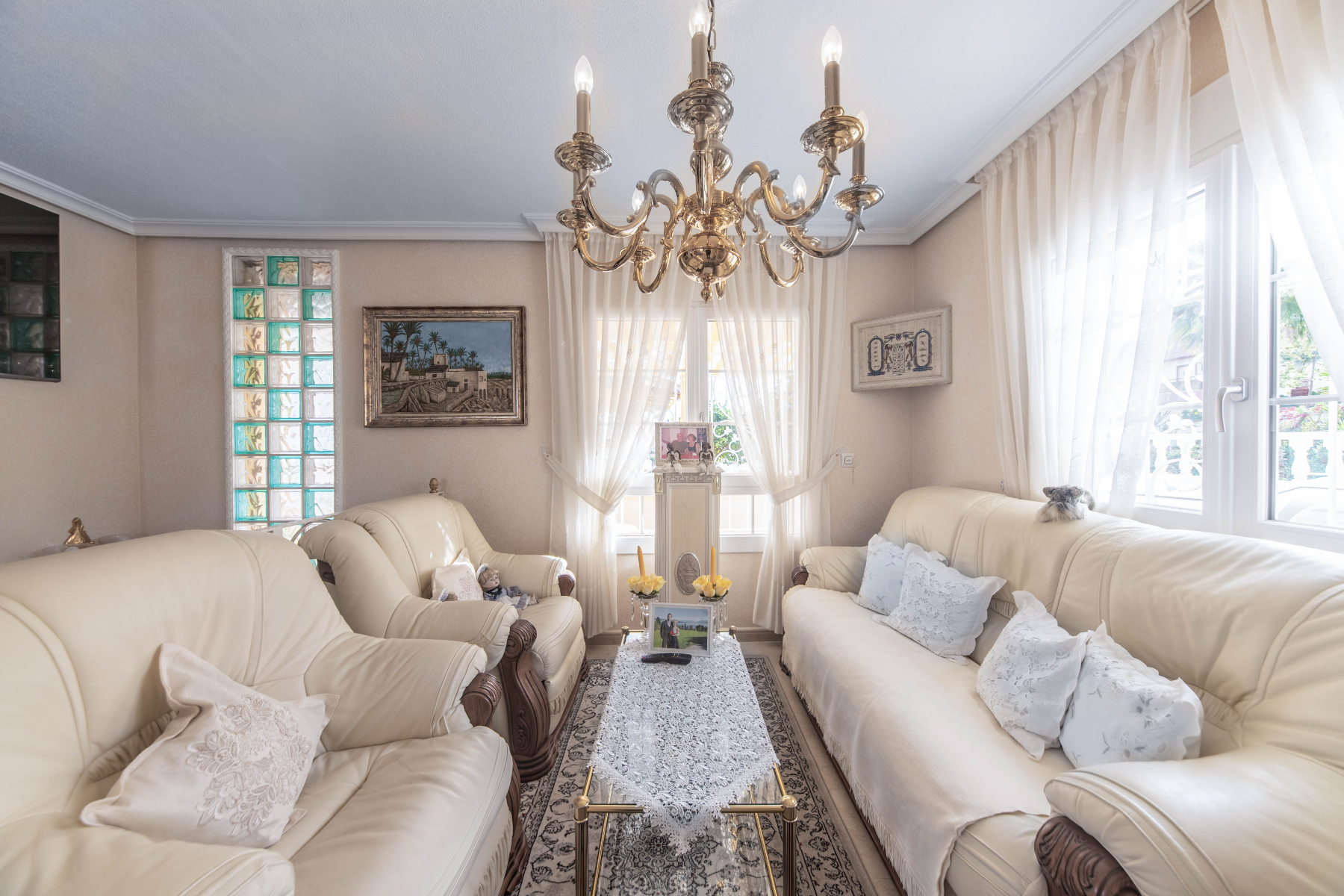 Här presenteras denna villa till salu i La Marina, som ligger i ett lugnt område i La Marina Urbanisation men ändå bara en kort promenad från de närmaste bekvämligheterna. På fastighetens översta våning hittar vi huvudentrén, men inte innan vi passerar genom den prydligt stenlagda trädgården med en egen 6,5 gånger 3,5 meter stor täckt uppvärmd pool! Solmarkiserna precis ovanför verandans funktionella pelare ger extra skugga till denna lummiga exteriör. Det finns en täckt sittplats vid poolen med vacker utsikt över landsbygden och en annan sittplats på framsidan av fastigheten, så att du kan följa det varma medelhavssolskenet hela dagen.