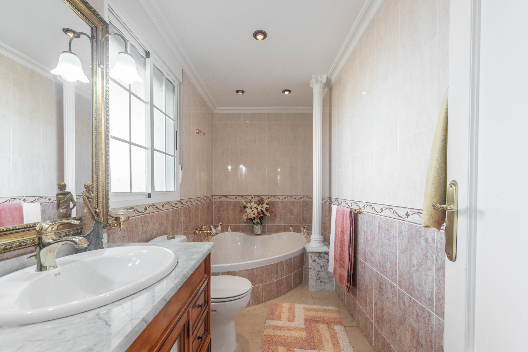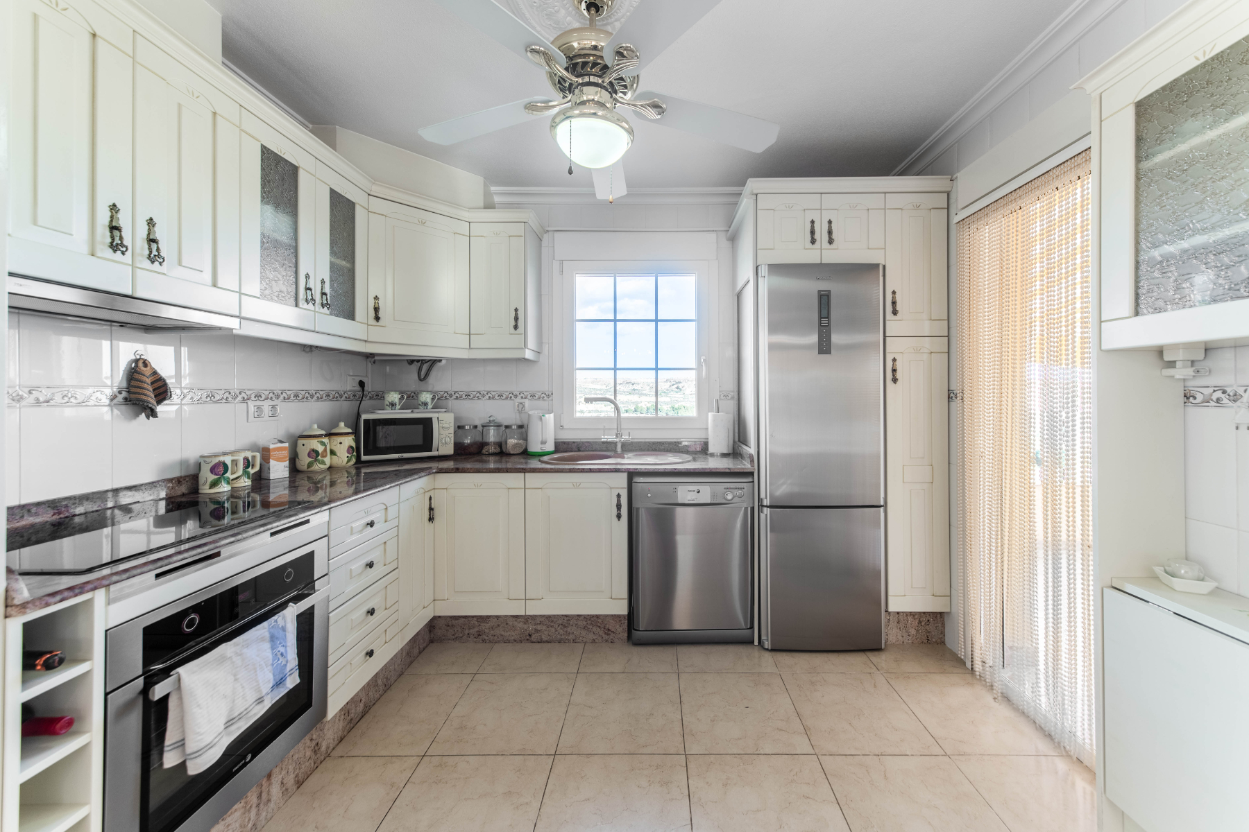 Genom en båge i grekisk stil kommer vi in i det moderna fullt utrustade köket som också leder oss till en annan solterrass med en sittgrupp. Detta förtrollande utrymme är perfekt för att njuta av en varm kopp kaffe utomhus medan man tittar på de fantastiska röda och lila soluppgångarna. Den panoramiska bergsutsikten är hisnande. Vi kan också hitta ett gästtvättrum, komplett med dusch, på samma våning.